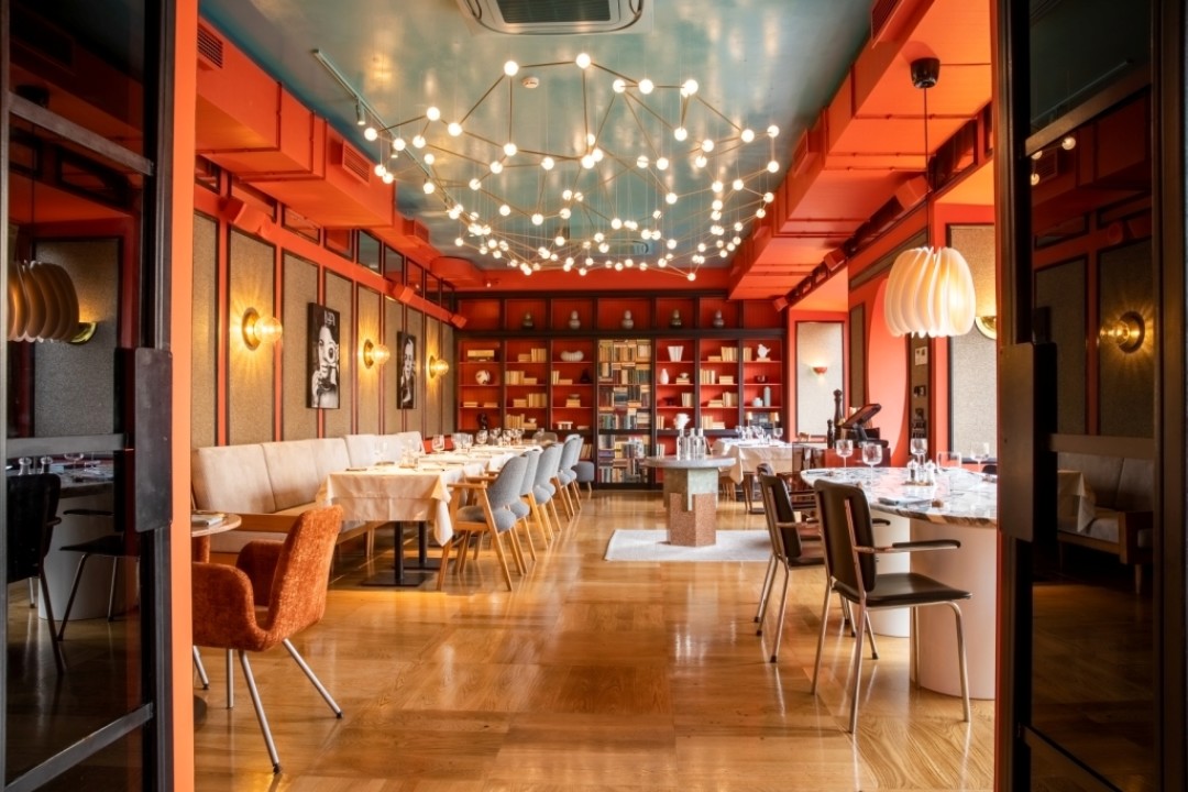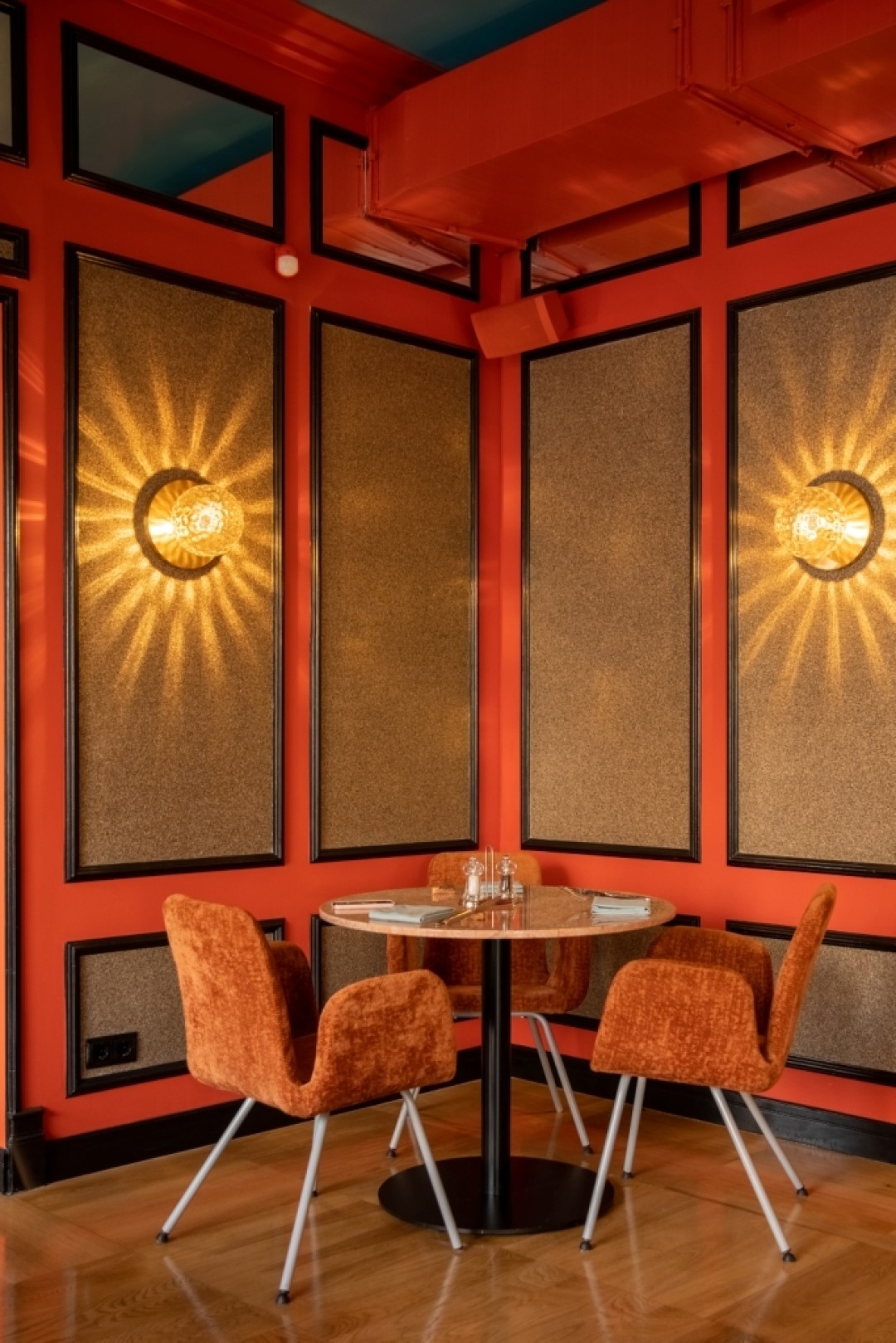 Латунные перила приведут вас на второй этаж, где расположены бар и ресторан. Вся концепция проекта выстроена вокруг Средиземноморья с явным тяготением к Испании. Здесь графичные, ярко-монохромные залы, в которых прячутся аквариумы и витрины с рыбой, secret-комната, замаскированная под книжную полку (еще не открыта, но скоро!). Дизайнер Анастасия Хальчицкая, когда-то оформлявшая Charlie, Grecco и Friends of Friends, выкрасила стены ресторана в ярко-алый, на бирюзовый потолок поместила световую инсталляцию, напоминающую мерцающее небо, а на деревянные панели посадила бра, точь в точь «звезды по имени Солнце».
