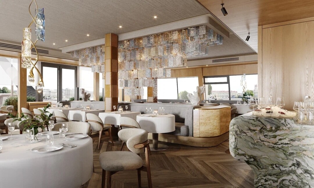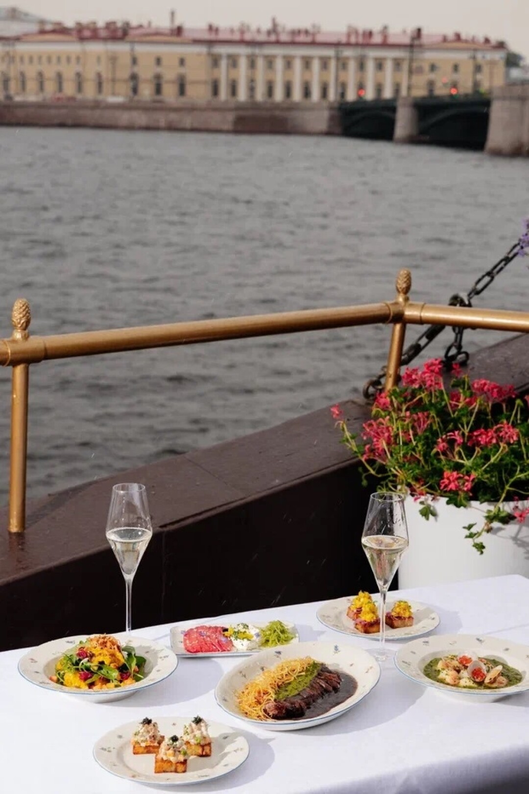 Без сомнений, с «Голландца» открывается лучший панорамный вид на Неву, Эрмитаж и Дворцовую, Стрелку Васильевского острова, Биржевой мост и Ростральные колонны. Все это лучше смотреть с открытой террасы на носу парусника. Внутри же — классический, не пафосный интерьер, в оформлении которого использовали шпон дуба теплых оттенков, текстурную мебель, объемную стеклянную люстру в центре зала и акцентное керамическое панно.