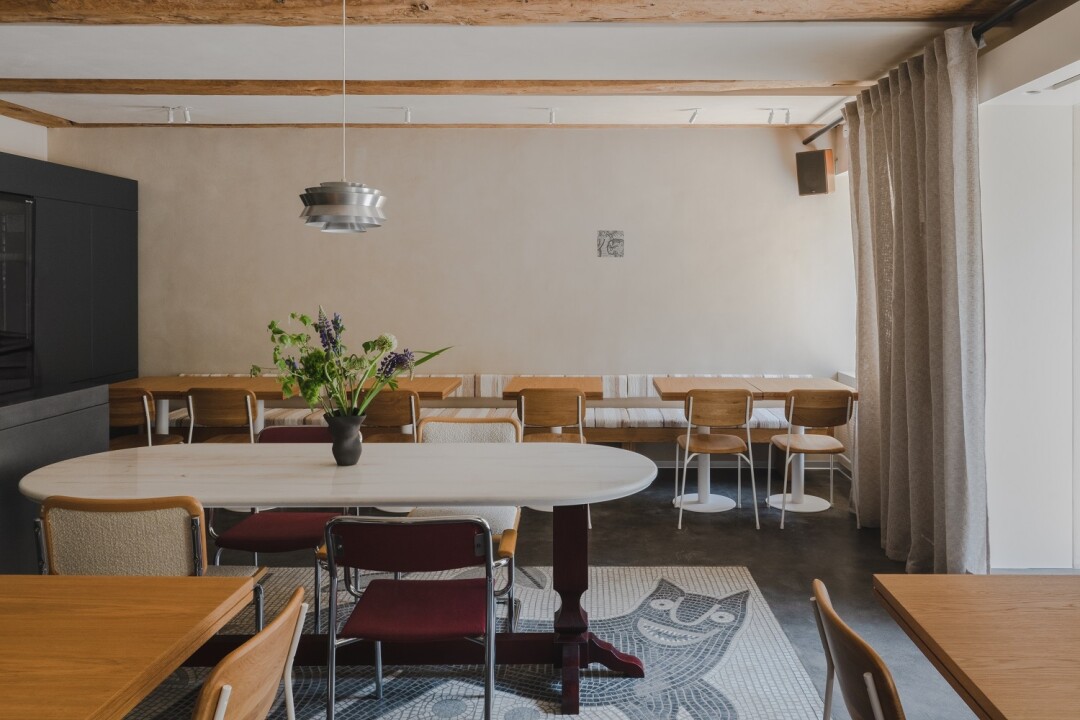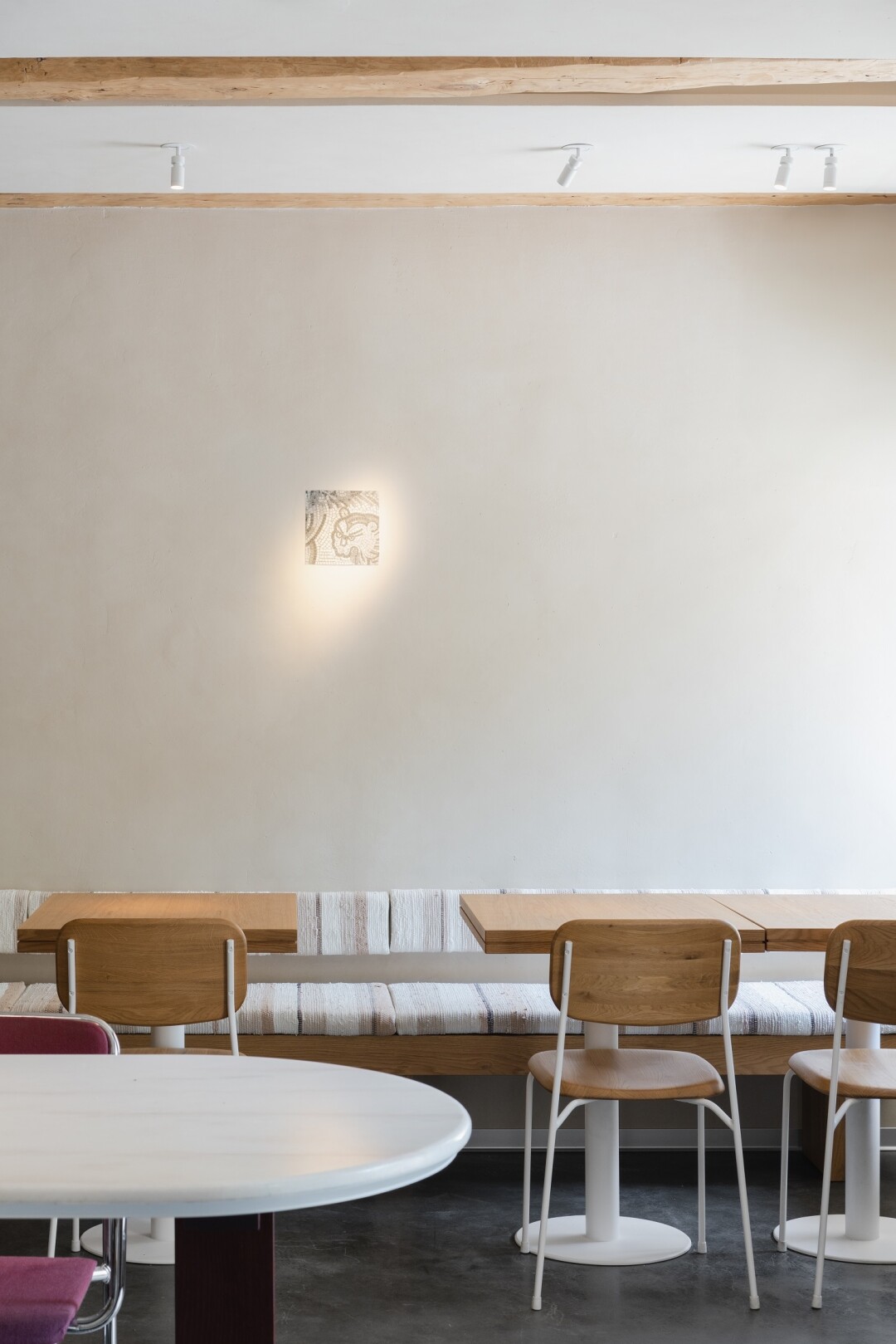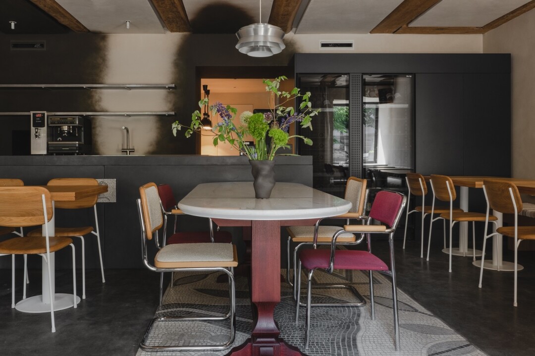 Самые востребованные городские архитекторы из DA Bureau проектировали пространство бистро. Получилось светлое, довольно минималистично оформленное пространство с использованием натуральных материалов в отделке и труда местных ремесленников. Посуда — советское ретро или Craft Ceramica. Мебель — сделана вручную мастером Вадимом Юшкевичем. А всю роскошную мозаику в панно собирал монументалист Кирилл Романов. Чтобы выразить свой респект, команда увековечила на своей форме имена всех, кто помогал в открытии.