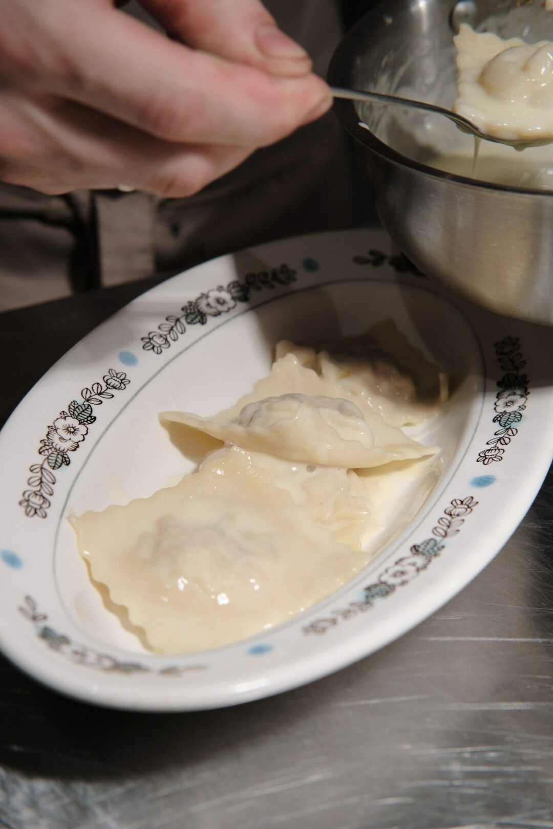 Перед трапезой вас обязательно угостят чашкой горячего грибного капучино, в меру яркого и правильно настраивающего на дальнейшие итерации. Пробуйте сочный зеленый салат с чистым во вкусе айоли из мясистой корюшки, печеный перец рамиро с бурратой и добавленным рыбно-соленым характером сальсы из анчоусов и оливок. Вся паста — свежак. Есть понятные равиоли с горгонзолой, маскарпоне и грецким орехом, ньокки с панчеттой и сливочным соусом из сыра пекорино или спагетти с насыщенным мясным соусом. Виды и начинки будут все время обновляться.