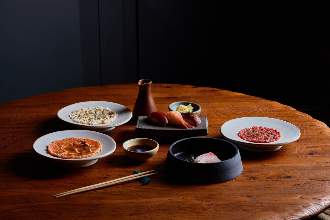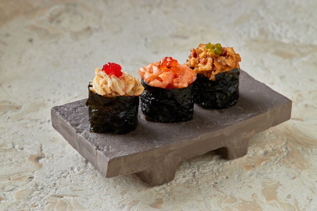 В raw-баре всевозможные ежи, суши и сашими, премиального голубого тунца аками и желтохвоста подают в золотой рыбке, необычном плато, символизирующем карпа (маскот проекта). На гриле готовят шашлычки и топпинги для самолепной лапши, а на пару — дамплинги из тонкого теста с бульоном, среди начинок — с грибами, уткой и крабом. Есть небольшой раздел с роллами — гребешок и черная икра, японская хамачи, вегетарианский с авокадо и васаби или с самой мраморной говядиной вагю.