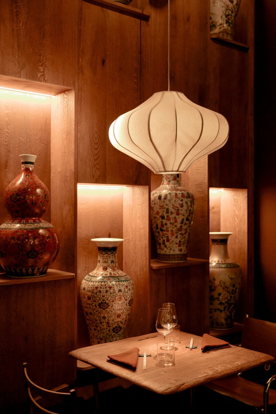 KOI расположился в «Доме 12» рядом с аркой Валлен-Деламота (там, где раньше работал Cococouture Матильды Шнуровой). За азиатский постмодерн в интерьере ответственен римский дизайнер Фабио Бронда (Marso Polo, Fresa’s). Вход больше напоминает портал в японский квартал с расклеенными азиатскими постерами — это совместная работа команды Фабио и нейросети. Внутри ресторана тоже все про детали. Стены украшают невероятные керамические маски, изображающие фольклорных героев. Например, юной красавицы Ко Омотэ с зачерненными зубами по моде эпохи Хэйан из японских сказаний и легенд. Ваза ручной работы сделана специально для Koi в Грузии, стоит на винтажной тумбе ХХ века, рисунок тоже выполнен вручную.