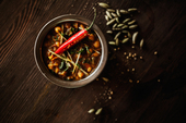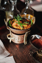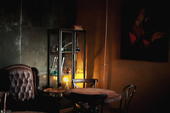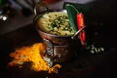В просторном меню почти страница вегетарианских блюд – нут и черная чечевица, овощи и нежный сыр панир, но не обошлось и без мясного лобби – в лоснящемся металлическим блеском тандуре куриное филе доводят до румяной сочности прямо на глазах у посетителей. Для тех, кто чувствителен к градусу остроты, рекомендуют уточнять ее заранее, хотя и настаивают, что она обязательна – как для Индии, так и для Петербурга: последнему, вероятно, в силу того, что положительно влияет на психосоматику, а попросту говоря, повышает настроение. Если острое вообще противопоказано – есть мягкие и нежные как ладони ребенка лепешки, которые вполне могут заставить завидовать любителей погорячее. В любом случае, будет интересно – в теплом свете, пробивающимся сквозь затянутые окна, под изумрудными библиотечными лампами и строгим присмотром видевшего Гудини лекарского инвентаря даже плошка риса может стать необыкновенным приключением.