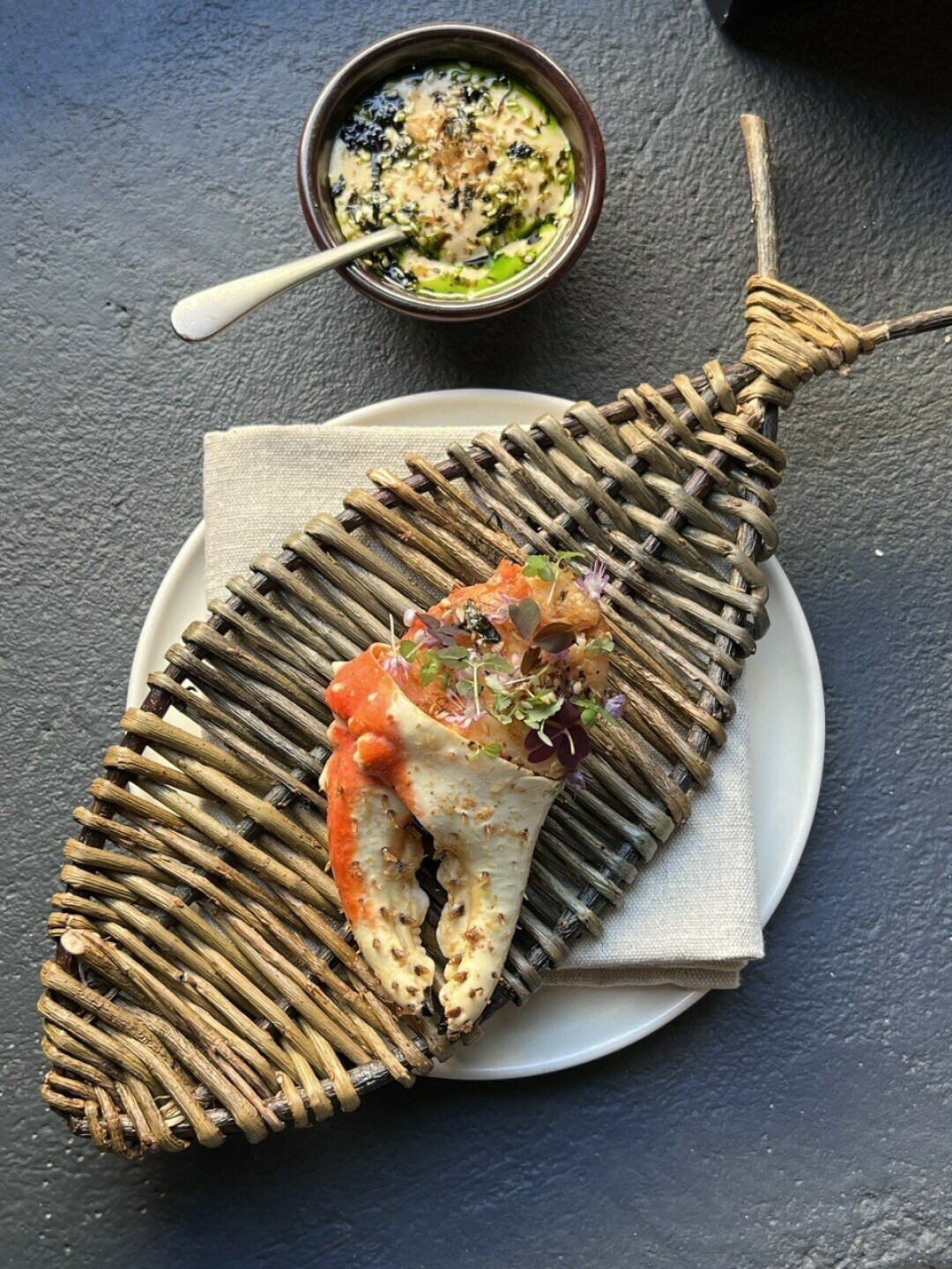 Новый ресторан от старых знакомых: раньше за серф-энд-терф мы ездили в старинное здание завода на Арсенальную набережную, но Grebeshki решили стать ближе к народу и приплыли в Виленский переулок. За кухню отвечает бренд-шеф Ярослав Свинцов (экс-шеф, к сожалению закрывшегося «Лобби-бара заблудшего дракона»). Если вы у него спросите, что здесь попробовать в первую очередь, он посоветует «Закуску териберского рыбака». Это идеальное в своей простоте блюдо из раздела «Сырое» — тарелка свежайших морских ежей и гребешков с красной икрой. Обратите внимание на модиолус по-рокфеллеровски. Это крупные мидии, запеченные в стиле рокфеллеровских устриц — со шпинатом и сырным кремом. Юколу из форели, то есть сушено-вяленое мясо рыбы, популярное в Восточной Сибири и на Дальнем Востоке, Ярослав смешивает с красной икрой и добавляет немного томатного соуса.