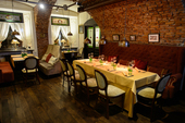 Европейской кухней в смелом исполнении шефа Винченцо Скуарчафико кормят в эклектичных интерьерах с кирпичной кладкой и расписными торшерами.