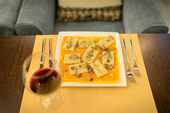 С особым тщанием относятся в ресторане к подбору вина: отдельно предлагается меню под аперитив, основное и десерты — с соответствующим выбором напитка. Сомелье Юлия Пухачева очень старательно собрала и лист с шампанскими винами, включая франчакорту, и списки с граппой и арманьяками. Ко всему, что есть в меню, чувствуется, подошли трепетно: маринованные оливки из стартеров — набор из семи видов, выросших в разных регионах Италии, и даже воду можно заказать, кроме обычного ресторанного набора, из Армении или Альп. Хорошо бы со временем такая разборчивость заразила бы и внешнюю политку ресторана.