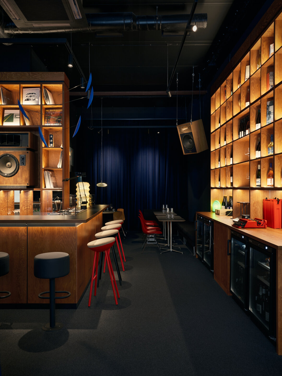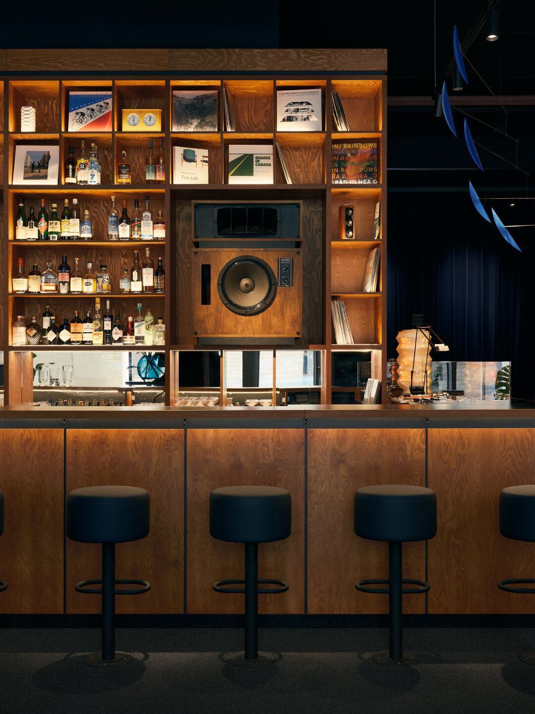 Архитектор Никита Капитуров воссоздал ретро-вайбы японских listening-баров 1970-х: стеллажи из лиственницы, коллекционный антиквариат и развес картин галерейного уровня, который будет ежемесячно обновляться. Каждый интерьерный лот — редкий и не замшелый винтаж: стулья Flötotto 60-х годов, советская светомузыка «Феникс» и лампа Tizio Ричарда Саппера (точно такая же хранится в нью-йоркском музее Метрополитен).