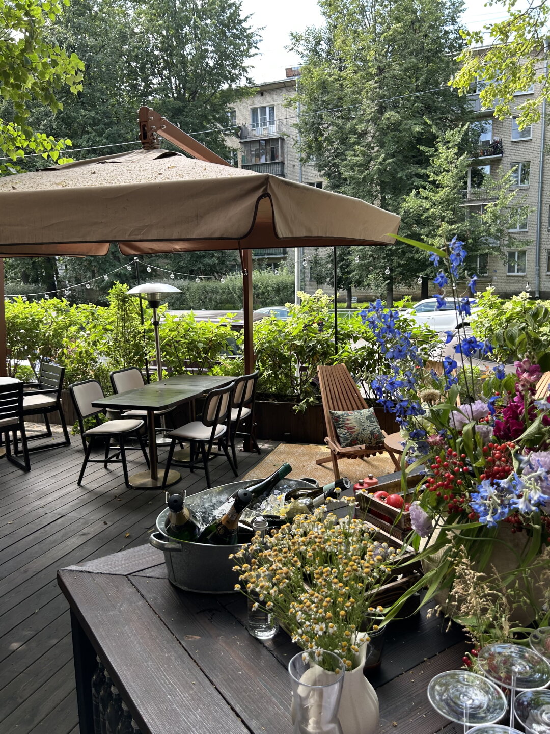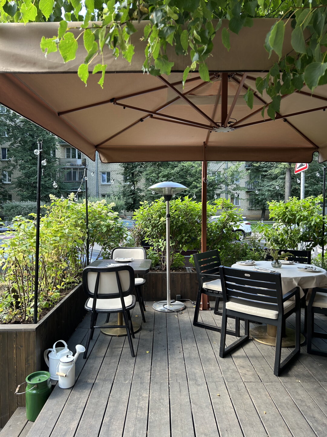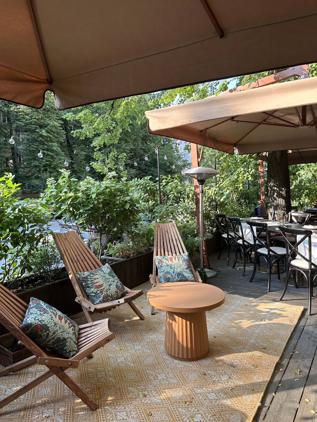 Дизайн «городской дачи» доверили молодому калининградскому бюро Line Design Studio — именно они создали нью-византийский стиль ресторана Πολύ (Poly). Их первый тактический успех — разворот особняка фасадом к Зелениной, так что теперь входная группа смотрит на Лодейнопольский сквер. Деревянную веранду застелили коврами, поставили шезлонги и по периметру засадили плодово-ягодными культурами от клубники и смородины до помидоров и огурцов. Отдельный эко-лайк ставим за решение не срубать раскидистые многолетние деревья, а аккуратно построить уличную посадку прямо вокруг них.