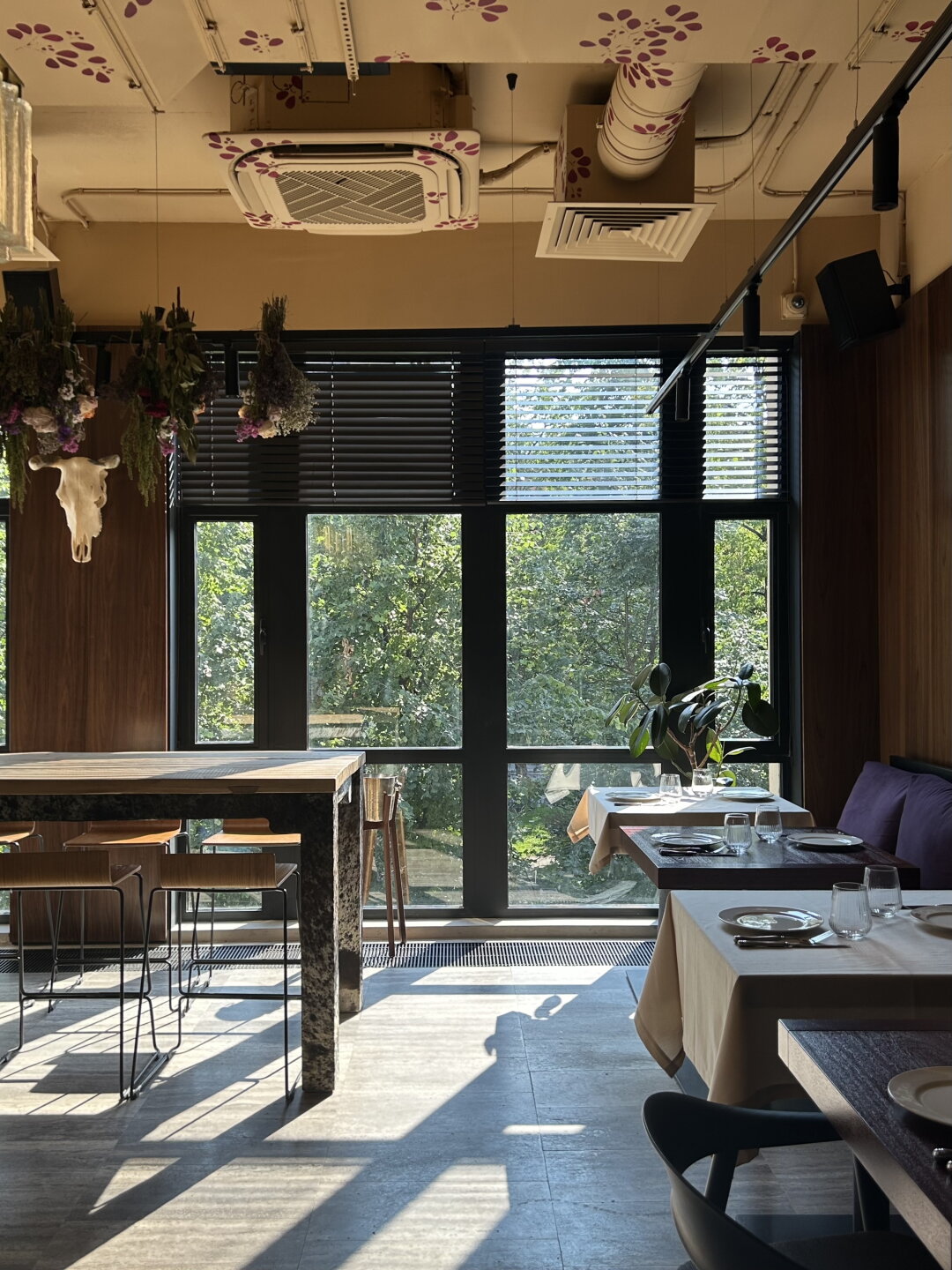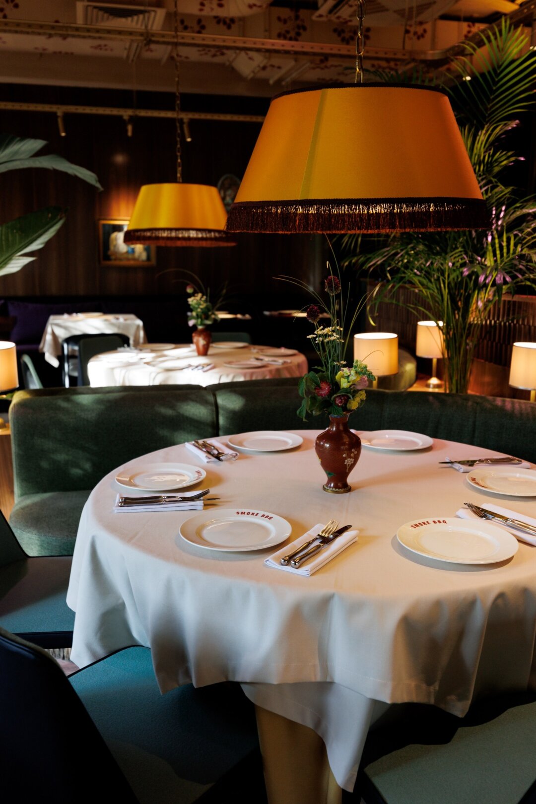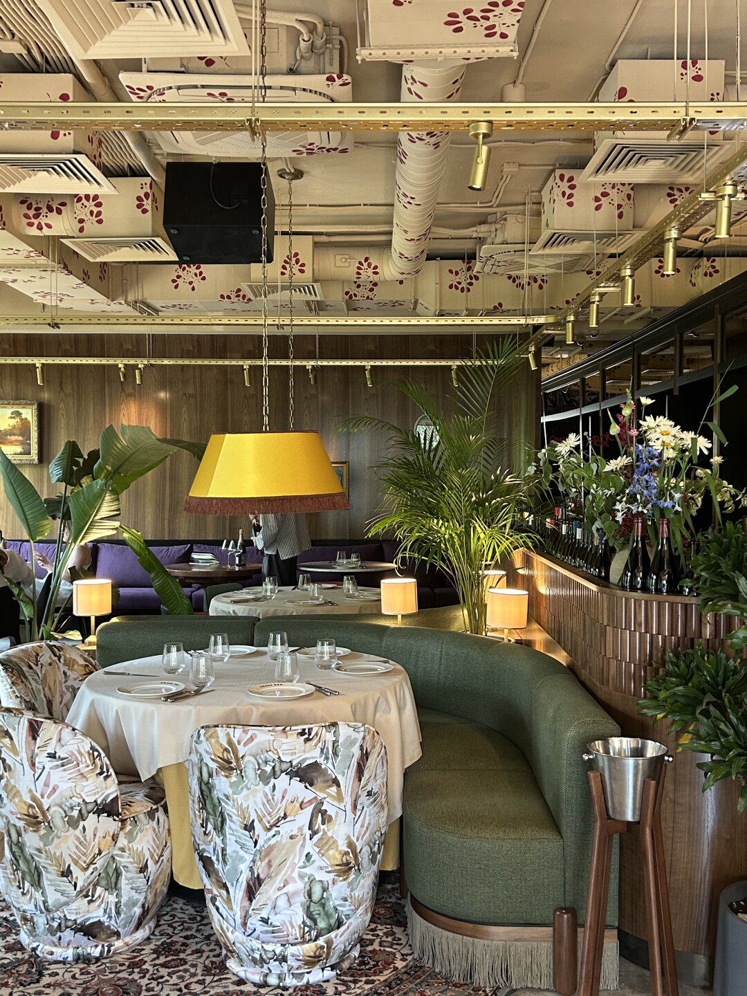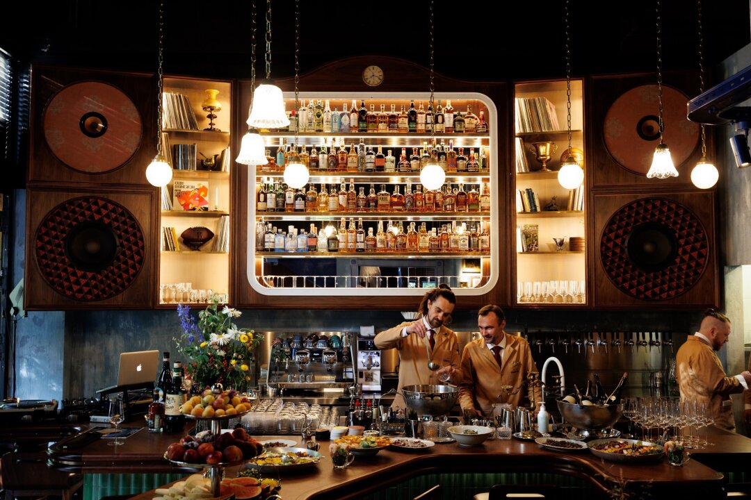 Первый, кого вы увидите внутри ресторана — метрдотель в нарядном шелковом халате. А сразу за ним — трюмо с алкогольной коллекцией (макси-версия того, что обнаружил Жорж Милославский в квартире у Шпака) и гигантскими колонками метрового диаметра, подключенными к виниловой саунд-системе. На втором этаже внимание цепляет потолок, закрашенный в цветочек вместе с вентиляционной системой, и, конечно же, открытая кухня, подсвеченная исполинской дровяной печью, мангалом и трехметровым смокером.