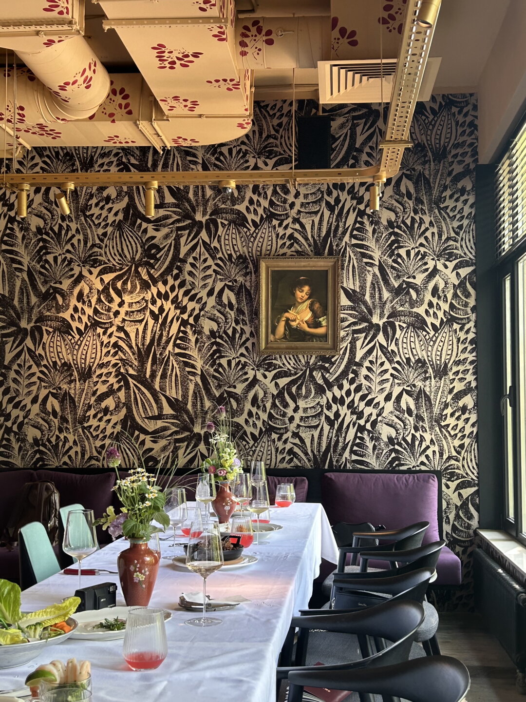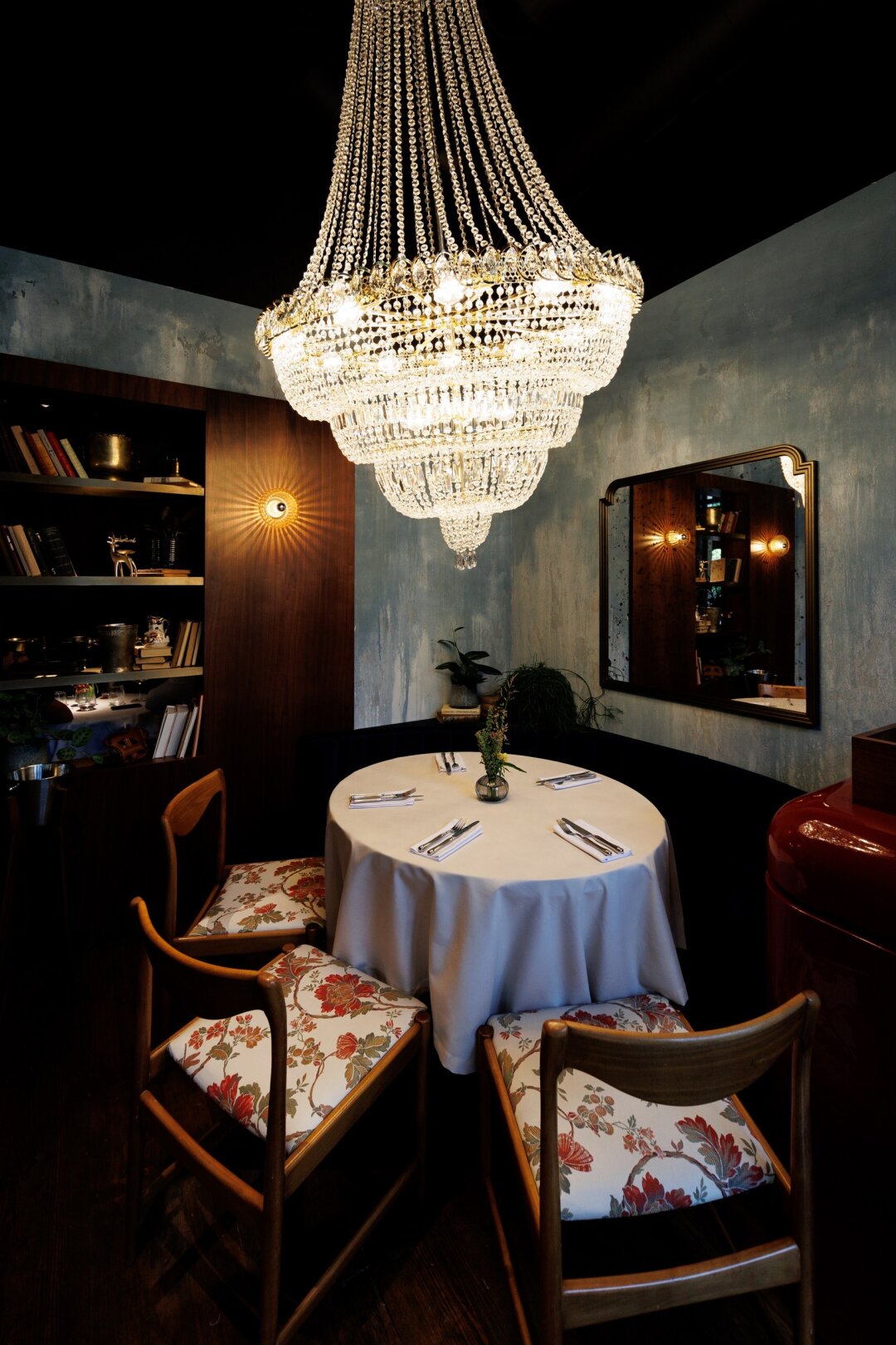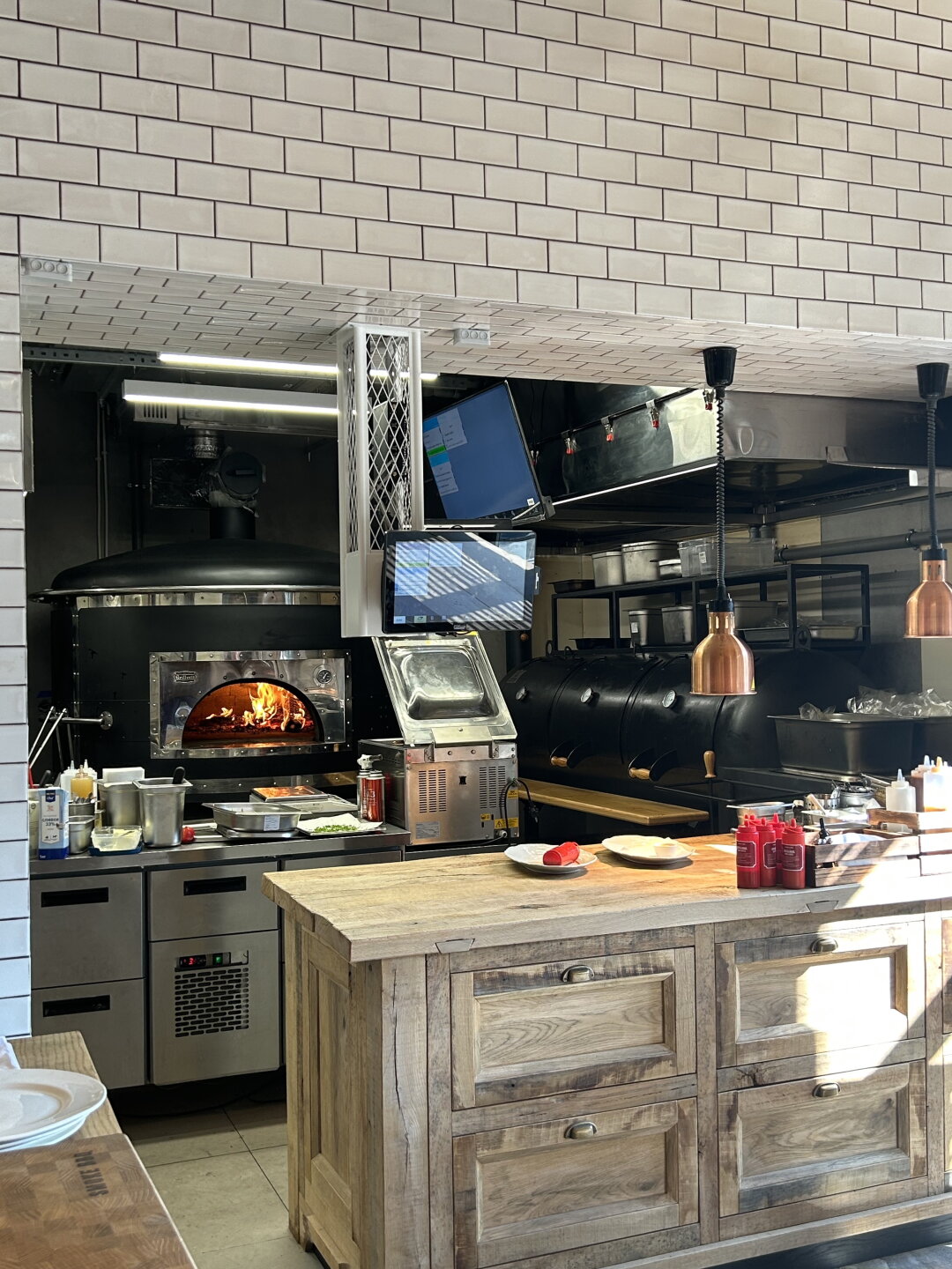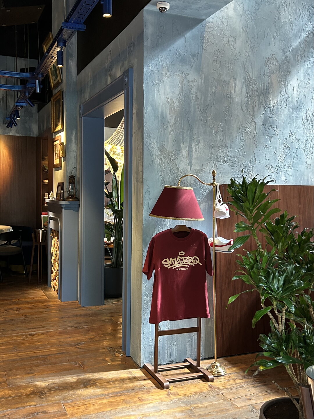 Первый, кого вы увидите внутри ресторана — метрдотель в нарядном шелковом халате. А сразу за ним — трюмо с алкогольной коллекцией (макси-версия того, что обнаружил Жорж Милославский в квартире у Шпака) и гигантскими колонками метрового диаметра, подключенными к виниловой саунд-системе. На втором этаже внимание цепляет потолок, закрашенный в цветочек вместе с вентиляционной системой, и, конечно же, открытая кухня, подсвеченная исполинской дровяной печью, мангалом и трехметровым смокером.