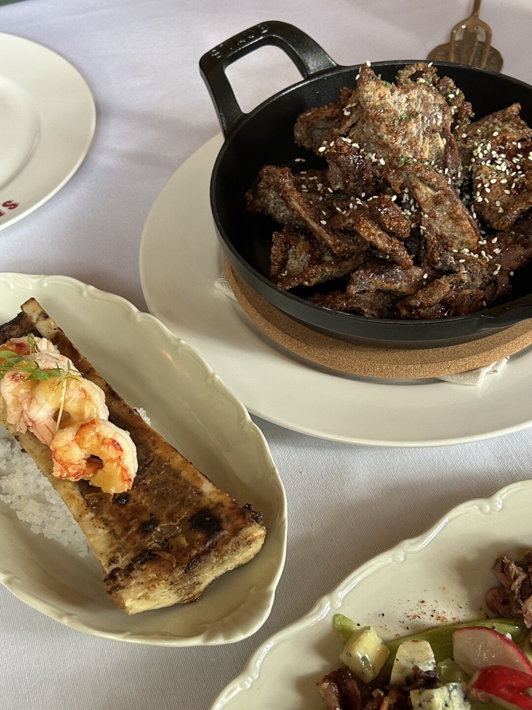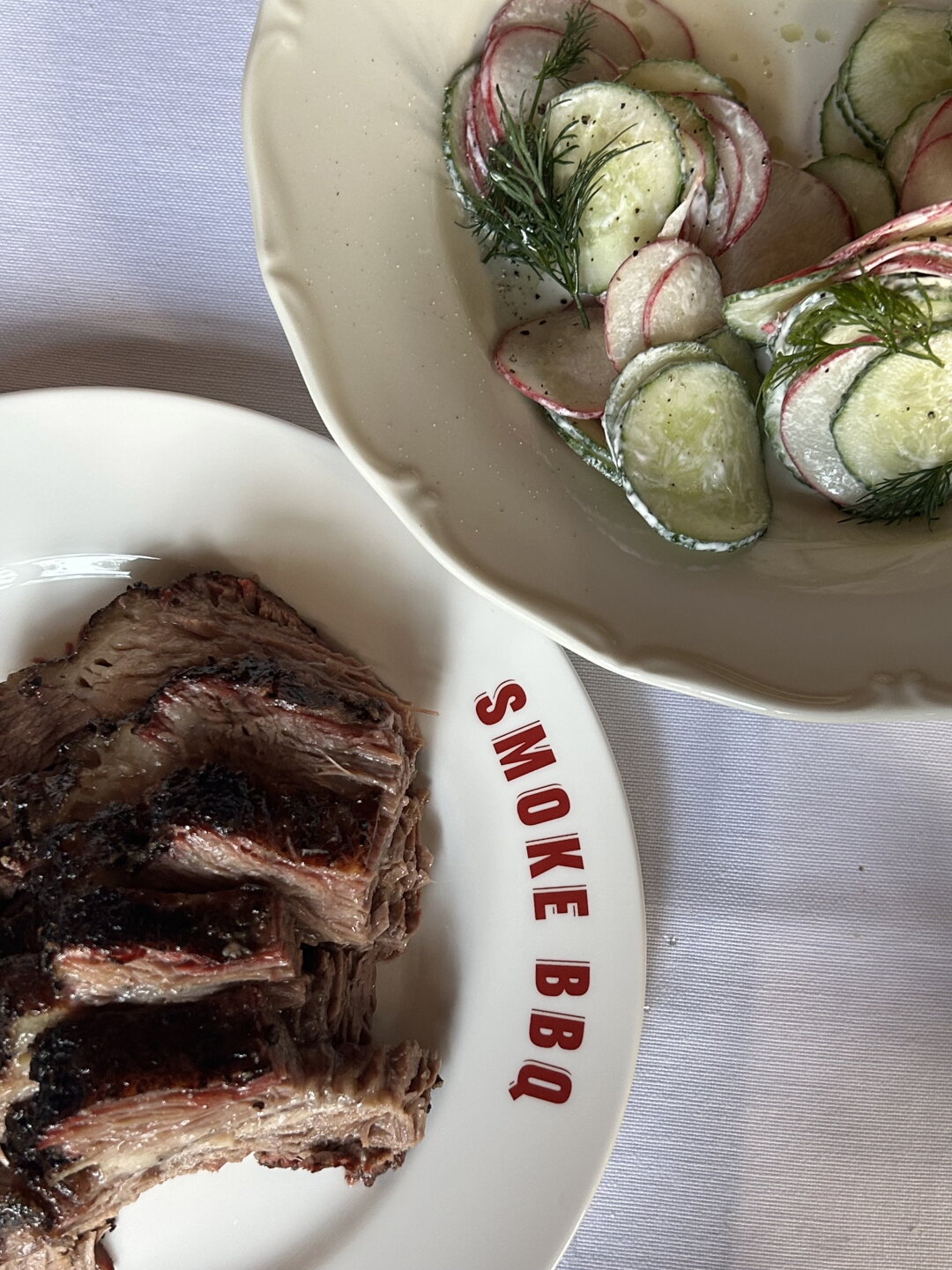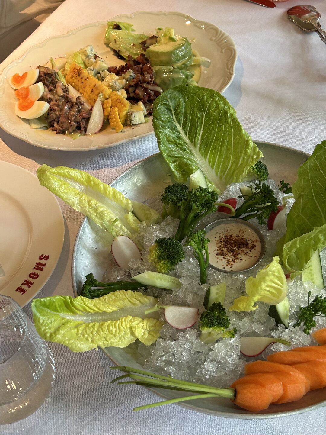 Как и в двух старших «Смоуках», за кухню отвечает бренд-шеф Dreamteam Алексей Каневский. В меню он соединил базу американских стейк-хаусов с тем, что так хорошо заходит на родных десяти сотках где-нибудь под Всеволожском — и приправил все щепоткой файндайнинга. От первых нам достались достойные Рокфеллера старты вроде креветочного коктейля, кобб салата и сифуда на льду (к гребешку — малиновый айоли!). Вторую категорию представляют лимонный криспи-картофель с боттаргой, гречка в эмульсии из печеной капусты с лососем из печи и старый-добрый-летний салат из огурца и редиса со сметаной.