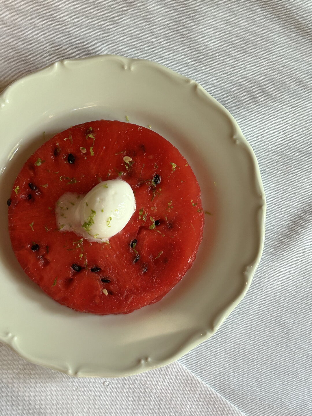 Для глюкозной подзарядки обращаемся к десертам: «пропитка с пирогом» трес лечес (откроем секрет, что шеф расщедрился и вместо трех добавляет сразу пять видов молока и плюсом — арахисовую пасту) или наш джокер в ответ на козыри жары — стейк из ледяного арбуза с сорбетом из каффир-лайма.