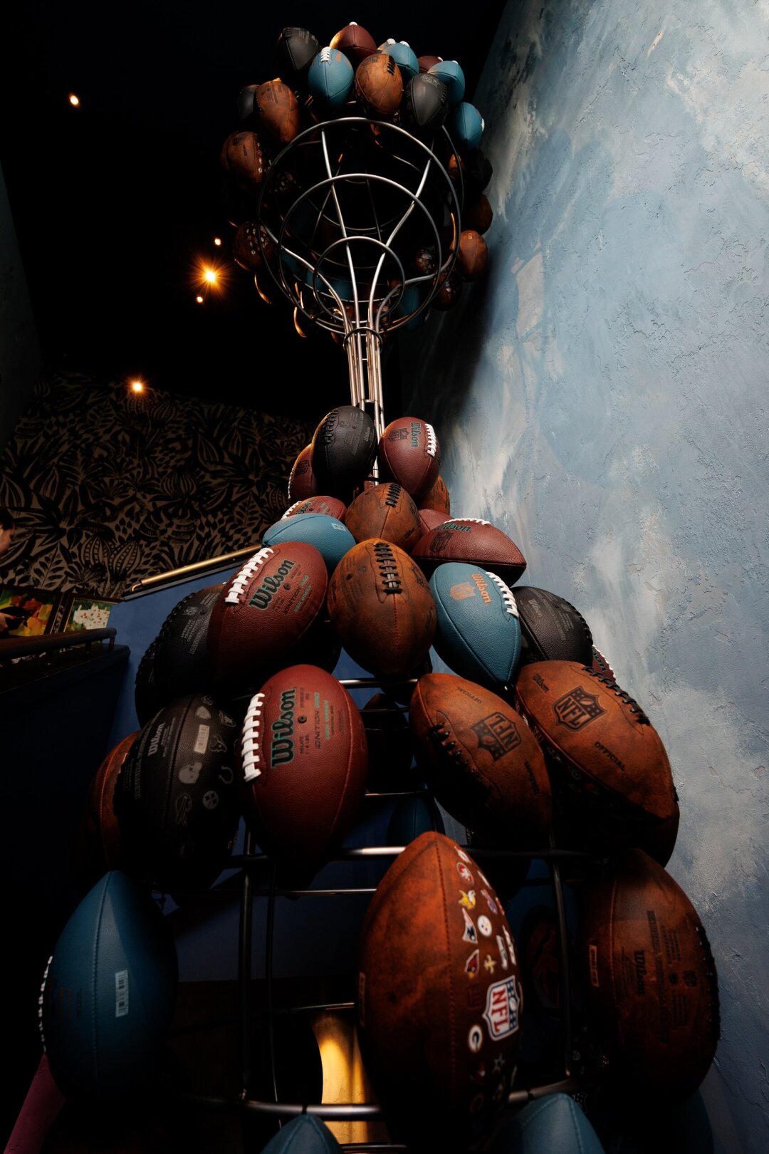 Настроение задают большие окна в пол (да будет свет!), разнохарактерная меморабилия и интерьерообразующие предметы вроде слегка подбоченившейся «пизанской» люстры из хрусталя и надлестничной инсталляции из мячей для регби.