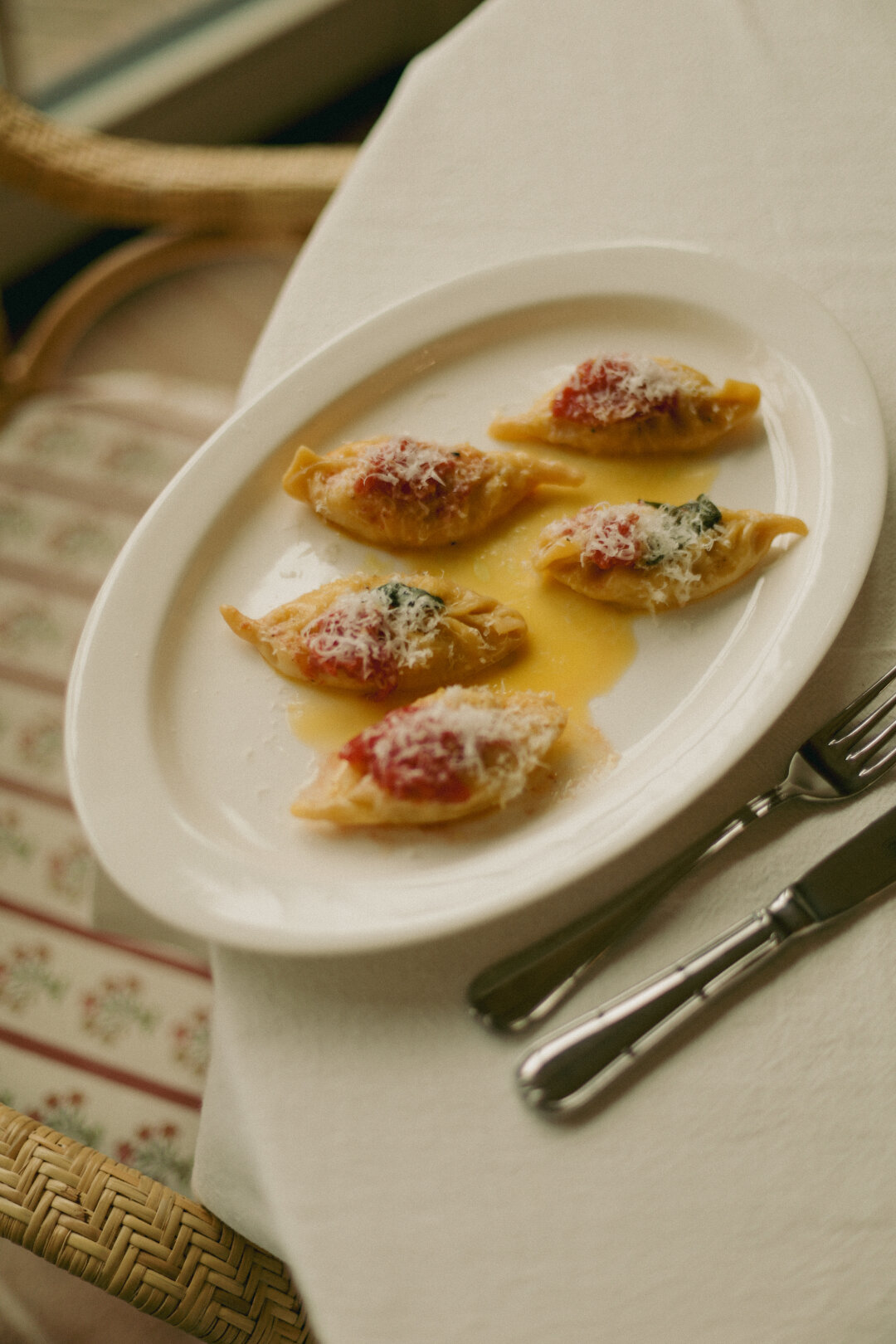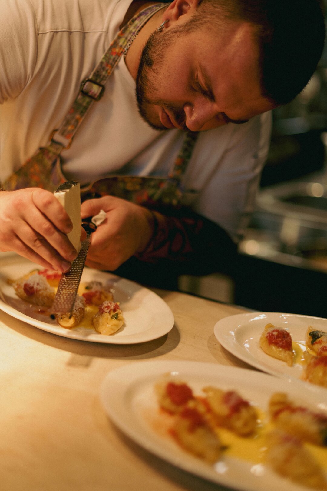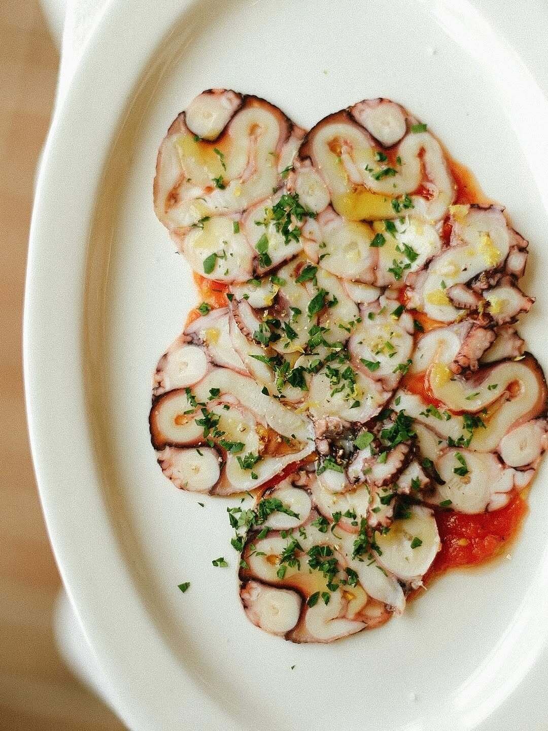 Открытой кухней (с открытым огнем!) дирижирует шеф-повар Роман Грачев (Mad Asian BBQ). На старт — по дефолту — домашний картофельный хлеб с кусочками томатов и чеснока, который подается вместе с маслом с перебитой петрушкой. Все, что касается теста, выполнено безукоризненно: от пирога дня, энсаймады (специалитет Майорки!) и бриоши на закваске до итальянских вареников с картошкой и овечьим сыром, пиццы с картошкой и пармезаном и домашней пасты.