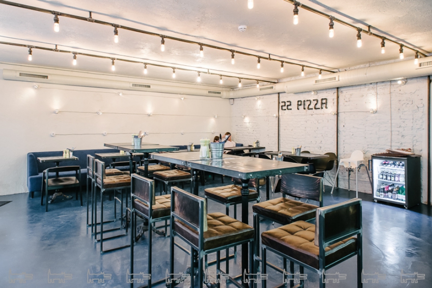 Интерьер: Очень аскетичный интерьер — побеленный кирпич, параллельные прямые индустриальных лампочек, сваренный металл стульев — как-будто призван не формировать атмосферу, а служит для того, чтобы просто не отвлекать от происходящего на открытой кухне ритуала ручной работы с тестом и огнем.