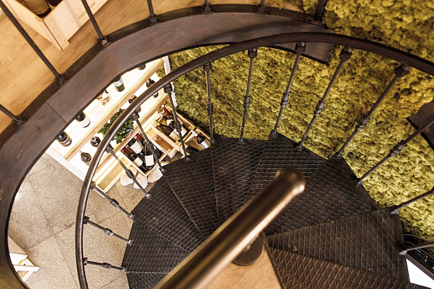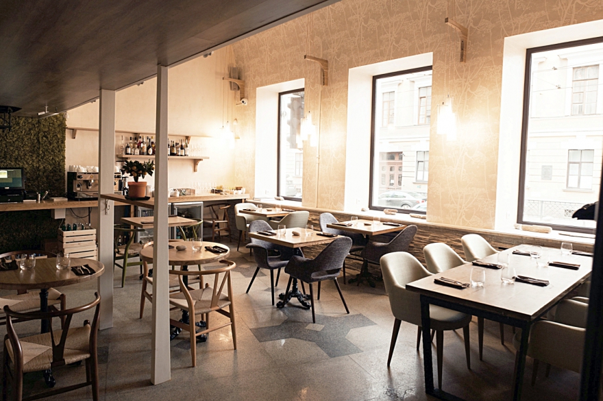 Если задуматься, как мог бы выглядеть скандинавский гастрономический тренд newnordic по-петербургски, то Gras как нельзя лучше подходил бы для иллюстрации. Интерьер не обдает холодом излишней лаконичности, но и декоративностью не злоупотребляет — полированное светлое дерево, нежно-травяной цвет стен, стеклянные двери и кресла, цвет которых идеально описывает британская идиома salt & pepper. Самые выразительные объекты здесь — панно из мха и крутая винтовая лестница с кованными перилами — как-будто оммажи местным болотам и дворцам. Через общую входную группу (но у каждого свои двери и гардероб) находится дочерний бар Madbaren с упором на коктейльный фудпейринг, но он получился таким симпатичным самостоятельным, что и рассказывать о нем стоит отдельно.