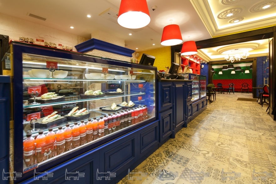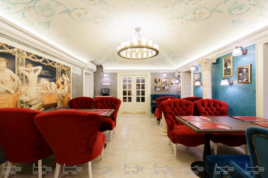 Не нужно обладать интеллектуальной мощью перипатетиков, чтобы обнаружить увлеченность Античностью: детская школа — «Сократик», коворкинг — «Агора», бутик-отель — «Ахиллес и черепаха». Появление своего общепита, видимо, было очевидным вопросом времени — как и греческого корня у его названия. Слово «симпозиум» переводится с древнегреческого как «пиршество», хотя можно ставить на то, что у 99% соотечественников имя заведения будет ассоциироваться с конференц-холлом. Трехэтажный проект устроен так. На первом — кафе, на втором — ресторан, кормящий по меню a la carte, и на третьем — череда банкетных залов. Обставлено все в традициях французского салона плюс очень яркие цвета и барельефы, коринфский ордер и бюсты софистов со скептиками повсеместно.
