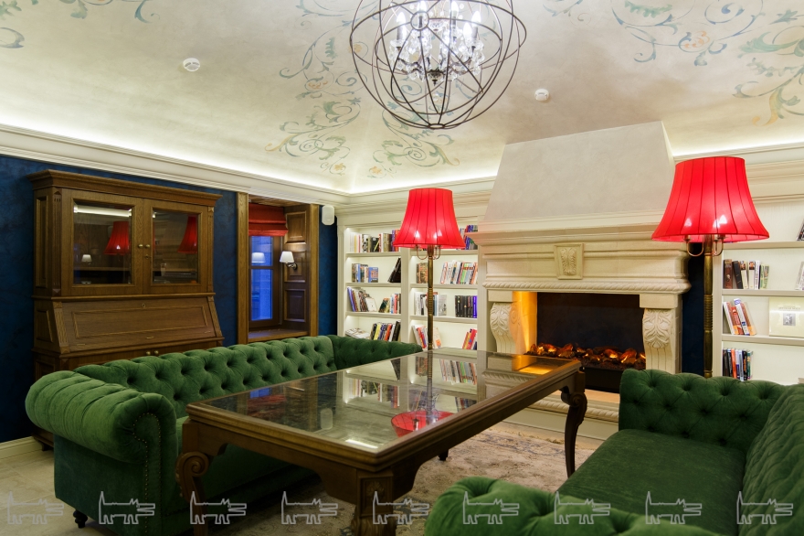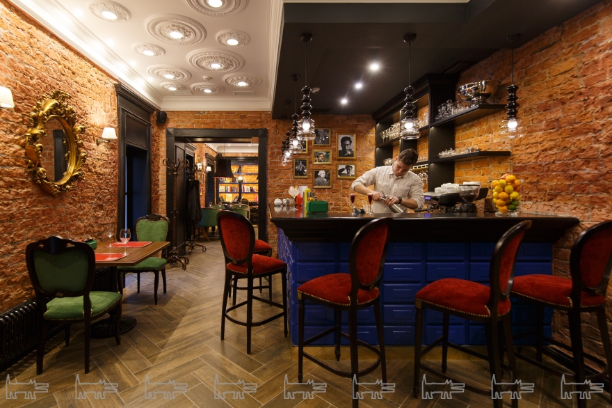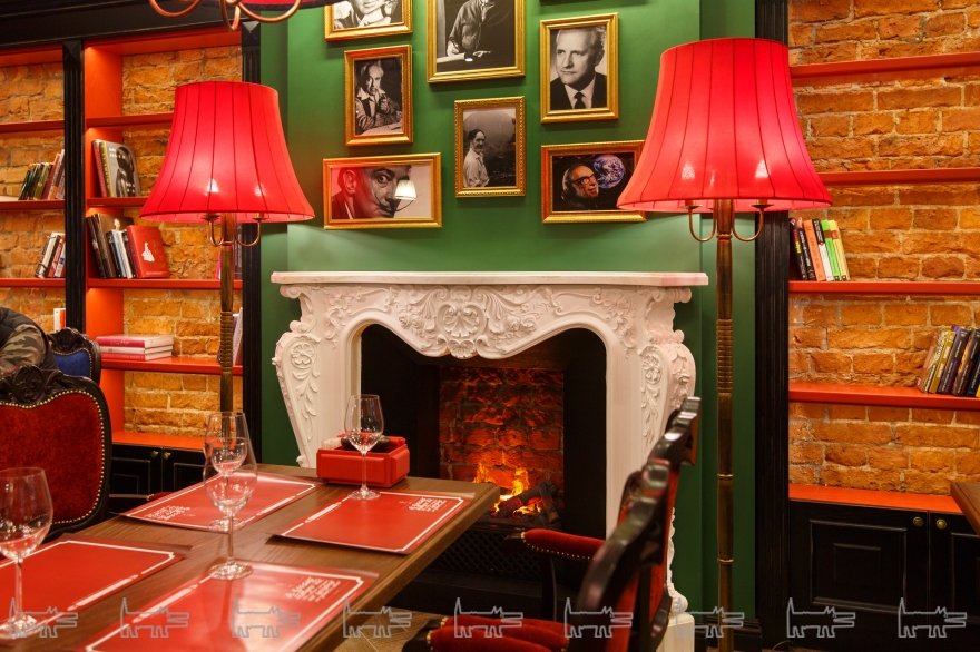 - Книги в шкафах по второму этажу ресторана — не декоративный элемент, их можно приобрести. Портреты по всей территории — преимущественно ученых и популяризаторов науки.