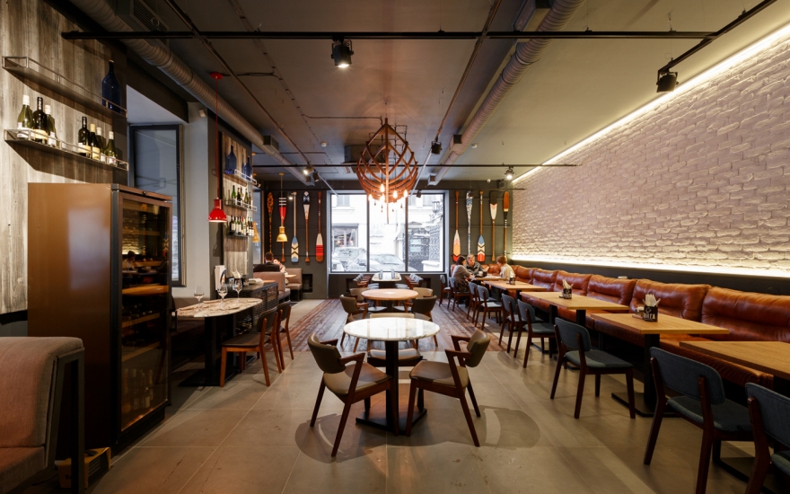 Меню: В крабовой секции — позиции от фаланг с топленым маслом до паровых булочек бао с крабом и соусом хойсин, хотя самую выгодную сделку предлагают в разделе «Горячее»: отличную пасту казаречче с соусом биск и уверенной порцией крабового мяса за 540 рублей. Магаданские креветки дают на льду, тигровые — с сухарями с овощными чипсами, копчеными на ольхе, в томатном соусе или ошпаренными в белом вине: у последних чуть больше термической обработки, чем хотелось. Мидии делают в четырех соусах — в том числе в сливочном с рокфором и в белом вине с цедрой. Обитатели северных морей представлены ладожским судаком с рисом неро и муссом из тыквы, копченой карельской форелью и строганиной из муксуна. Что до жителей южных морей — барабульку жарят в специях, с рапанами делают жульен.