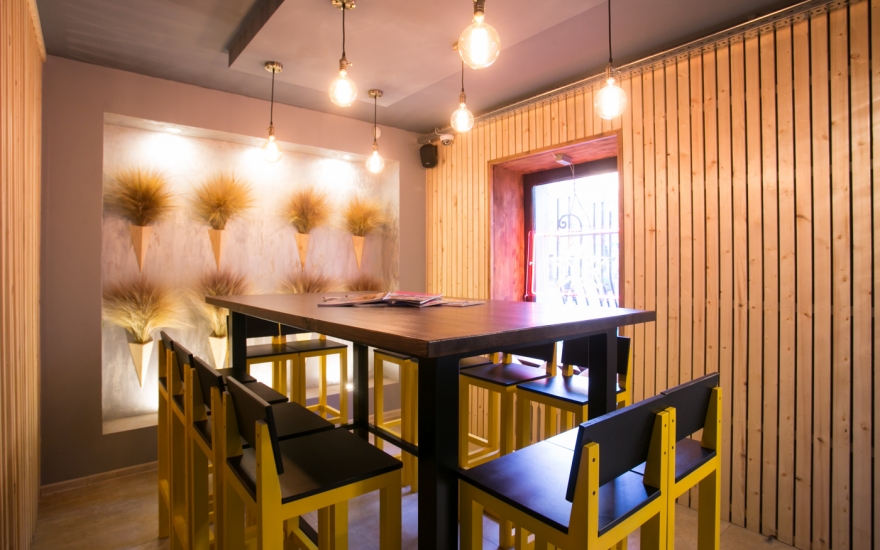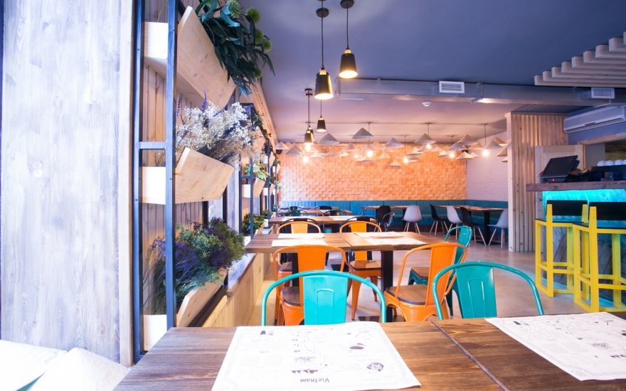 Интерьер: Основной зал — с большими окнами, барной стойкой с неоновой подсветкой и очень щадящей логистикой посадок, оставляющей много пространства. Вторая комната — более камерная с окном выдачи и телеэкраном. За национальный колорит отвечают рассредоточенные повсюду вьетнамские шляпы ноны — в том числе парящие стайкой абажуров под потолком.