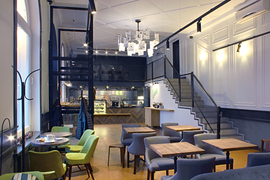 Интерьер: Пространство кофейни Ôpetit разделено на несколько функциональных зон. Небольшая барная стойка предназначена для тех, кто покупает продукцию на вынос. Также есть пространство с мягкими диванами с низкими столиками, с креслами у декоративного камина и посадки у больших арочных окон. Над открытой кухней построен второй этаж с большим столом.