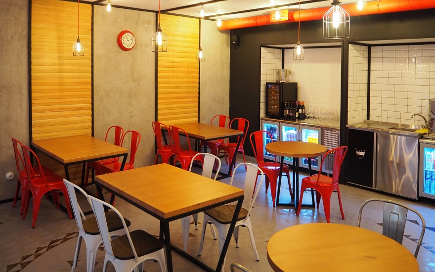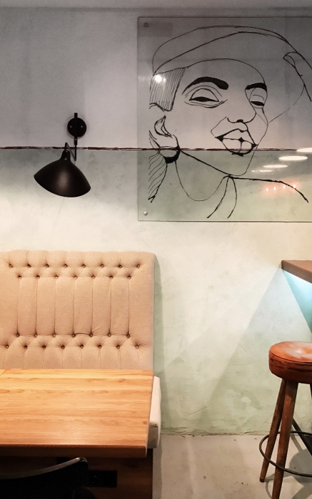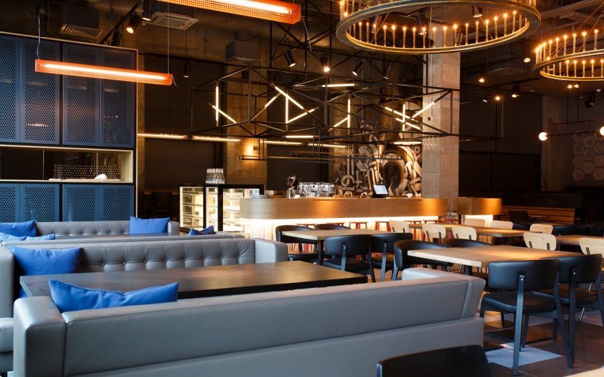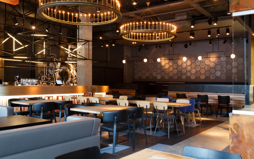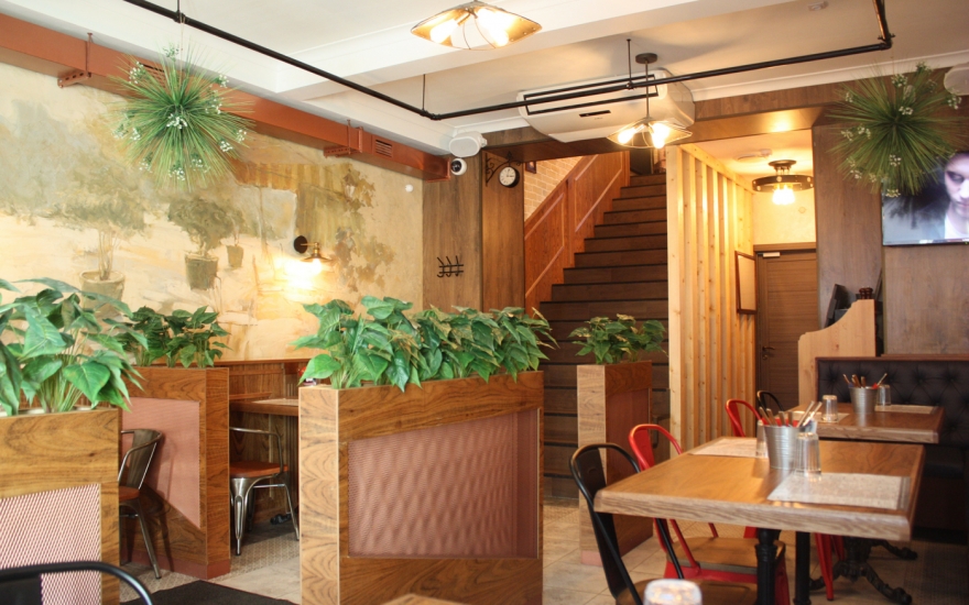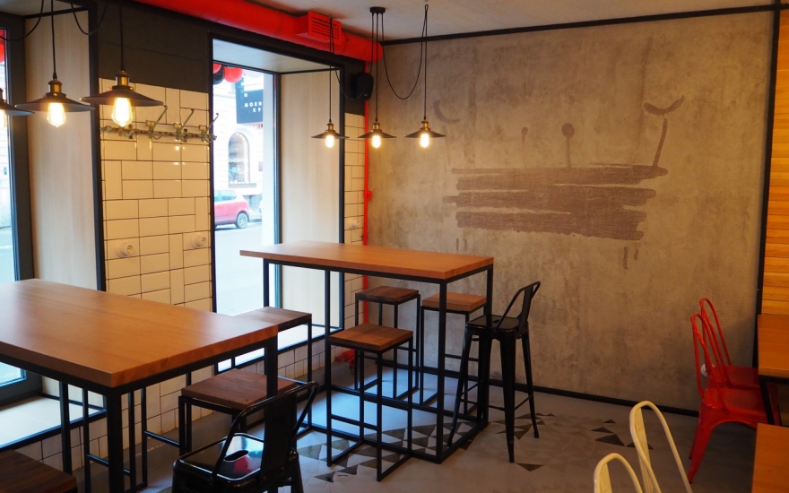 Интерьер: Машинерия открытого гриля, сверкающего своими решетками и колесами, уравновешена деревом, мрамором и трогательными мелочами: деревянной скамьей как в городских парках, шкалой для измерения роста или сотами из плитки. Сумев ангажировать знатного каллиграфа Покраса Лампаса, его урбанистическими росписями не стали покрывать весь зал, а отвели всего две стены: как раз для настроения, но чтобы не угнетать лишней брутальностью.