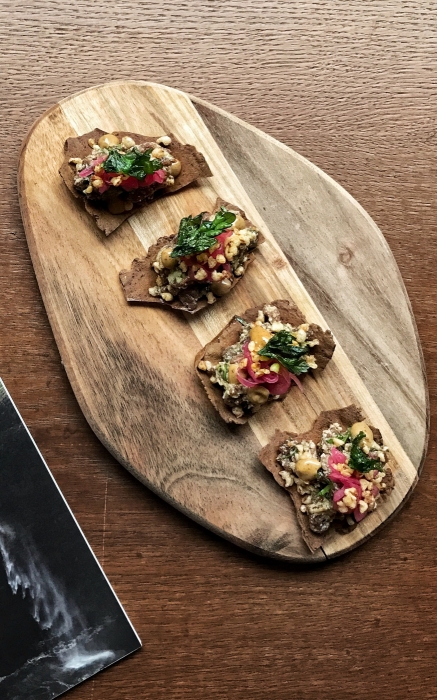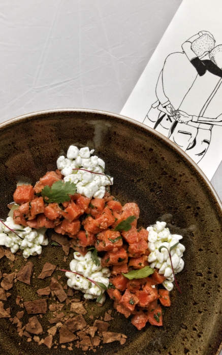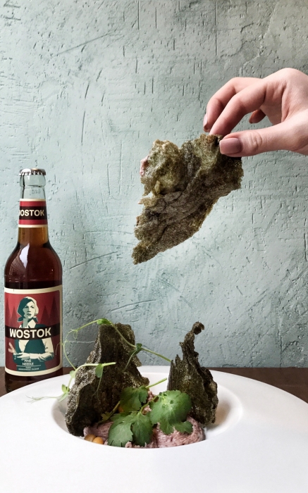 Меню: Новое заведение возглавил шеф-повар Глеб Герасимов: молодой экспериментатор знаком городу как су-шеф Олеси Дробот из бутикового ресторана Эдуарда Мурадяна «ЕМ» и автор еды в самый удачный момент жизни места Svoi. Меню в традициях петербургского нордика сверхлаконичное — не больше двадцати позиций. Среди закусок — тартары из оленя или нерки, хумус из красной фасоли с чипсами из нори, салат с кальмаром и огурцом и жареные артишоки. На горячее среди прочего — пельмени с телячьими хвостами, утиная грудка с булгуром и тушеным пореем и пшеница с тушеными овощами и тофу.