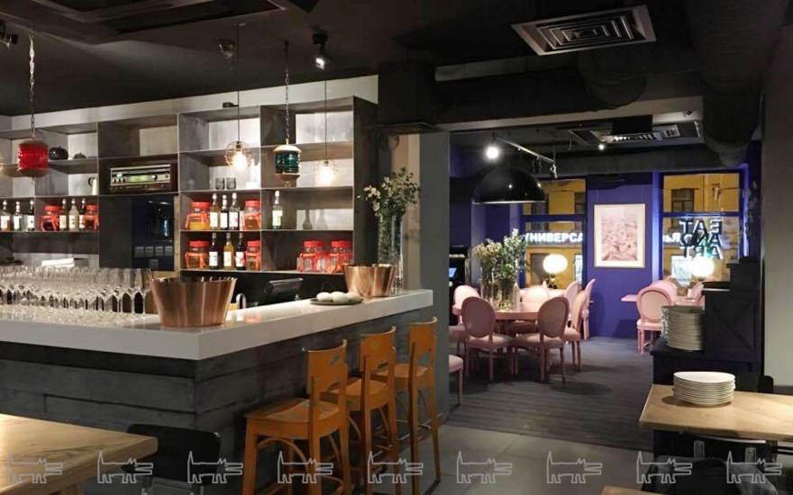 Идея выбить клин клином в итоге себя оправдала: даже если ты сидишь на пудрово-поросячьих креслах или под присмотром десятка вышитых на миниатюрных пяльцах современных художников, изобилие визуальных впечатлений тебе голову не кружит. Как ингредиенты многосоставного салата на вилке складываются во вкус богатого нюансами блюда, так и поп-ап-коллажи и прозрачные стулья, акварели, видеоарт и бетонная барная стойка складываются в комфортно обжитое помещение общепита — пусть и обжитое людьми с большой фантазией.
