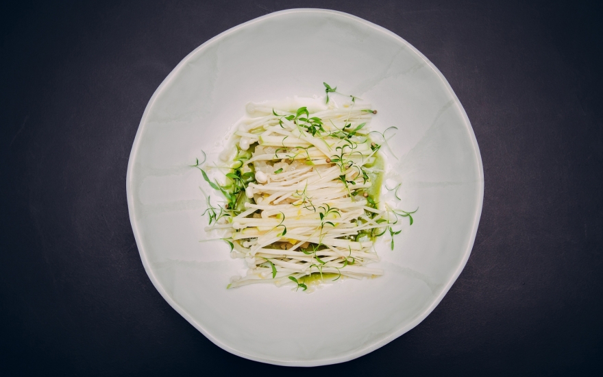 Во дворе здания, где располагались проекты Beatnik и «Бездельники», построили павильон под новый ресторан: пространство на 100 посадок в теплую погоду будет трансформироваться в открытое, стоит лишь распахнуть французские окна в пол. Меню создавает шеф-повар Руслан Закиров (Polet Cafe, «ЗиС», «Завтра будет кофе»), вдохновляясь японской традицией гастрономического минимализма, а также новейшими тенденциями осознанного питания. Например, минимальное количество соли в некоторых блюдах компенсируют водоросли – как в тартаре из авокадо с нори и проростками кунжута. Для приготовления утки используется чай лапсанг сушонг, который придает мясу деликатный копченый аромат – без копчения, к мурманской треске идет сладкий мисо-соус с брокколи и печеным яблоком.