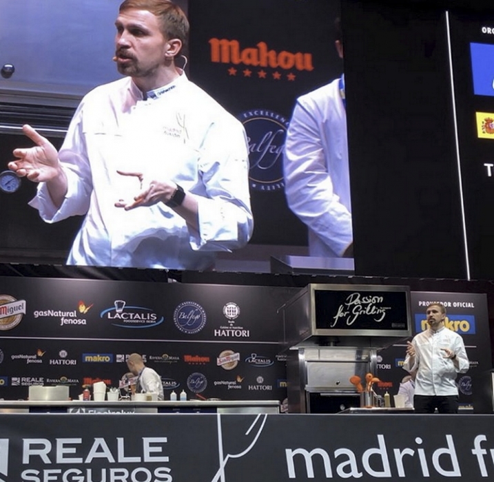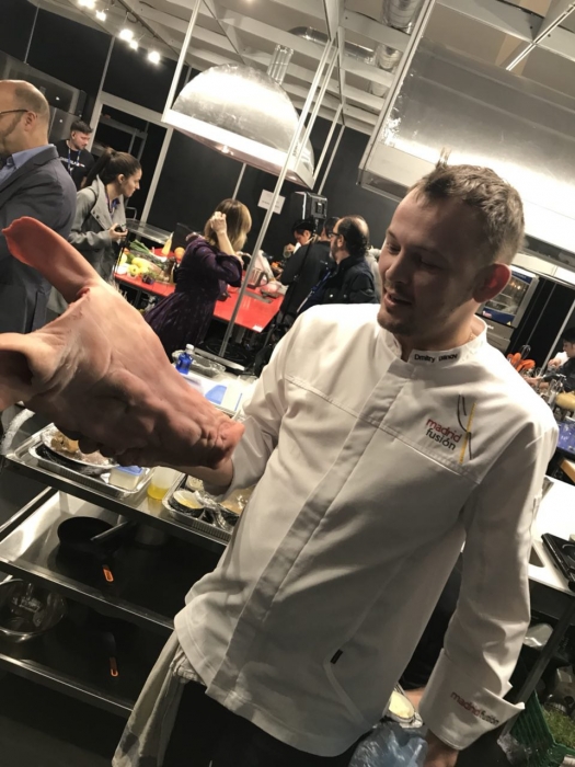Выступать было легко: мы делали презентацию на русском, нас синхронно переводили на испанский и английский. Я пошутил, что из свиной головы мы используем даже глаза, но их без спроса съел наш су-шеф, все смеялись — значит, и правда хорошо переводили. Выступать на главной сцене в официальной программе нас с Игорем отобрал лично президент Madrid Fusion Хуан Карлос, который летом 2017 года приезжал в Петербург. Есть и вторая наша делегация — которая представляла страну на русском стенде с нашими локальными продуктами: там трудились Сергей Фокин, Антон Исаков, Артем Гребенщиков и Илья Бурнасов.» |