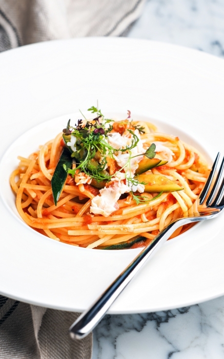 В заведении реанимировали итальянскую классику, отодвинутую в 2010-х в Петербурге на второй план: паста и ризотто, сибас и дорада здесь многообещающе хороши. На кухне шеф-повара Александра Саватеева, который успел поработать в ресторанах Francesco и Jamie's Italian, готовят кухню Италии очень технично — при этом с творческим подходом. Пасту заправляют как пиццу — четырьмя сырами: бри, пармезан, горгонзола и неожиданная в таком составе моцарелла складываются в соус с эффектом умами. Баклажаны делают в слишком плотном кляре, но внутри смогли сохранить овощу мягкую текстуру — как, например, в пармиджане из него же. Дораду и сибас делают по неаполитанскому рецепту «аква пацца», что означает «сумасшедшая вода» — с белым вином, каперсами, чесноком и оливками гаэта и добавляют немного чили — и кисло-пряный соус еще лучше подчеркивает деликатное мясо рыбы. Винная карта принадлежит авторству шефа-сомелье Дмитрия Вологи, известного по работе в Гранд Отеле Европа: в ней хитовые вина средиземноморского региона и современные артизанальные винодельни из Испании, юга Франции и Италии.