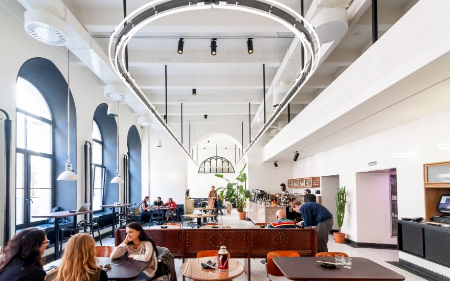Явке в формате «были все» способствует эстетское оформление, спродюсированное Андреем Перепечко, номинантом премии «Лучшие дизайнеры и интерьеры» «Собака.ru»: пространство напоминает то ли футуристическое привокзальное кафе, то ли неоготическую базилику. Цветочная лавка на входе, кстати, не бутафорская — колоритные комнатные суккуленты в брендированных горшках и креативные букеты вполне можно приобрести себе или в подарок.