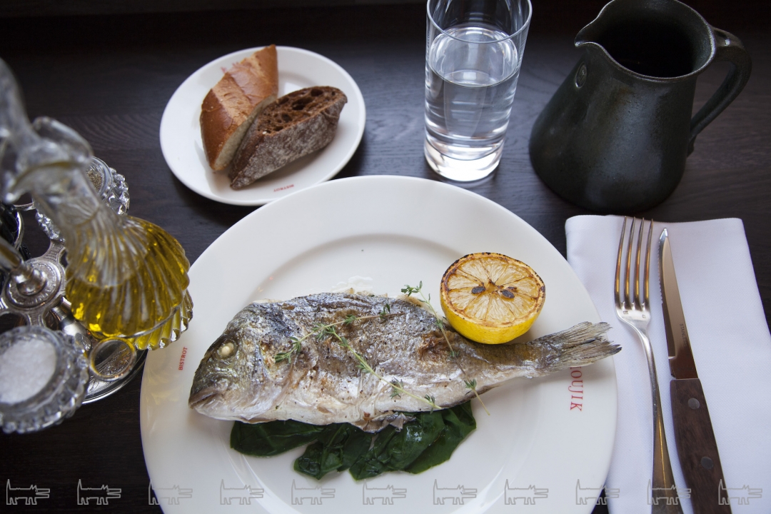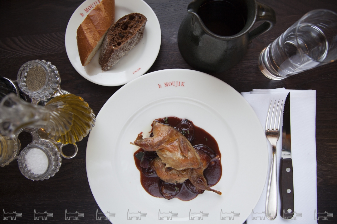 Готовят в духе французской классики — которой так недостает Петербургу вот уже лет как сто. В меню еда, какую встретишь везде в Париже — в Bistrot Victoires или в Le bistrot du peintre: утиный риет и утиная грудка, жаренная с персиками; ножка ягненка с чечевицей; непременно беф бургиньон с тушенной в красном вине говядиной и непременно устрицы; луковый суп с карамелизированным до сладости нутром и пирог на эльзасский лад; перепелка конфи с печеной сливой.