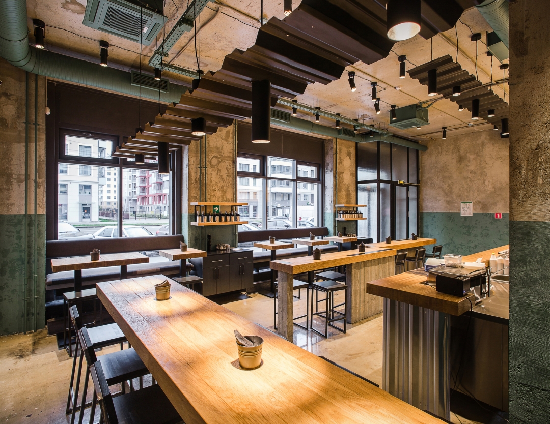 Внутри 30 посадочных мест и открытая кухня. Интерьером занималась команда DA architects – здесь много дерева, металла и бетона.