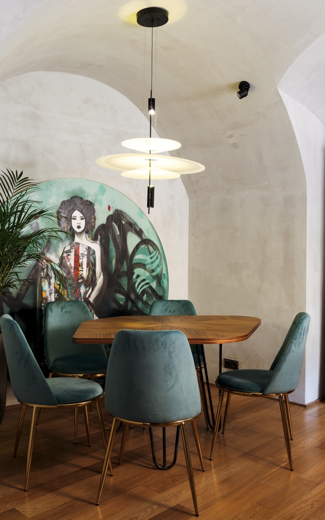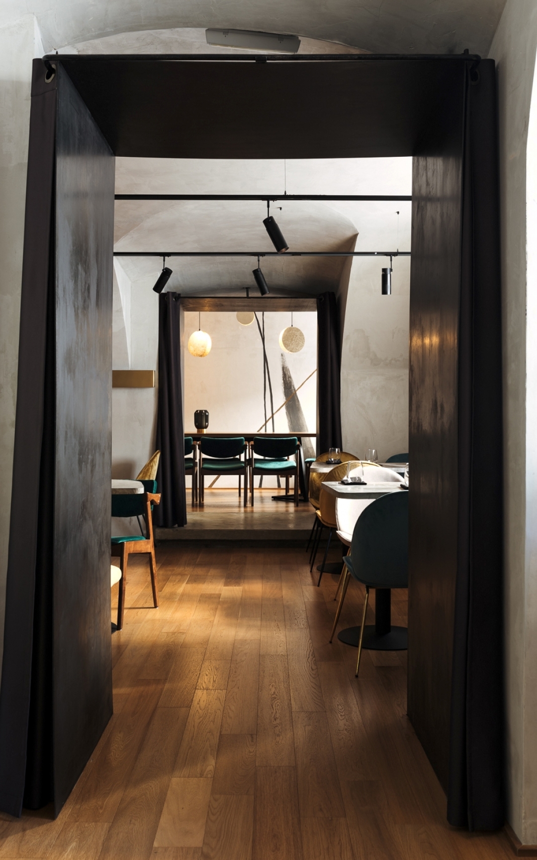 Дизайн помещения площадью порядка 230 кв. м, рассчитанного на 90 гостей, занималась петербургская архитектурная студия Art Gluck, которая совместила японский минимализм и европейский модерн: пространство над открытой кухней декорировано латунными листами, имитирующими рыбную чешую, на крашеных стенах – рисунки в азиатском стиле, часть столешниц сделана из бетона. Robata условно делится на две зоны: направо от входа тянется анфилада миниатюрных залов с классической посадкой, с левой стороны находится бар, где можно сидеть на высоких табуретах у окон или перед открытой кухней.