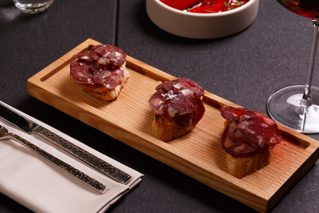 Обратите внимание на вяленую конину: этот «хамон» доставляют самолетами прямо из Казахстана, нарезают полупрозрачными слайсами и укладывают на хрусткий багет, сдобренный немного пряным томатным соусом.