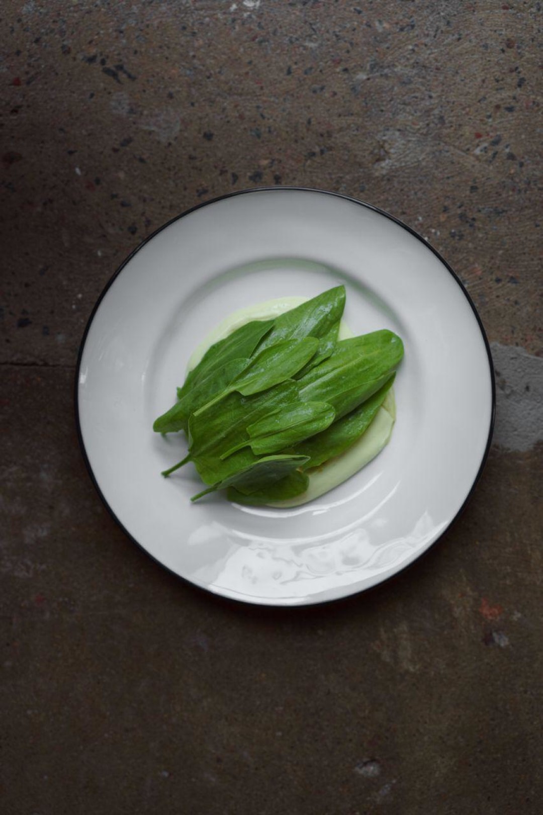 Капуста запекается с тимьяновым маслом до полуготовности, обжигается и подаётся с песто из кедровых орехов, щавеля и шпината. А из оставшихся листьев шеф-повар Виктория Мосина решила делать кимчи.