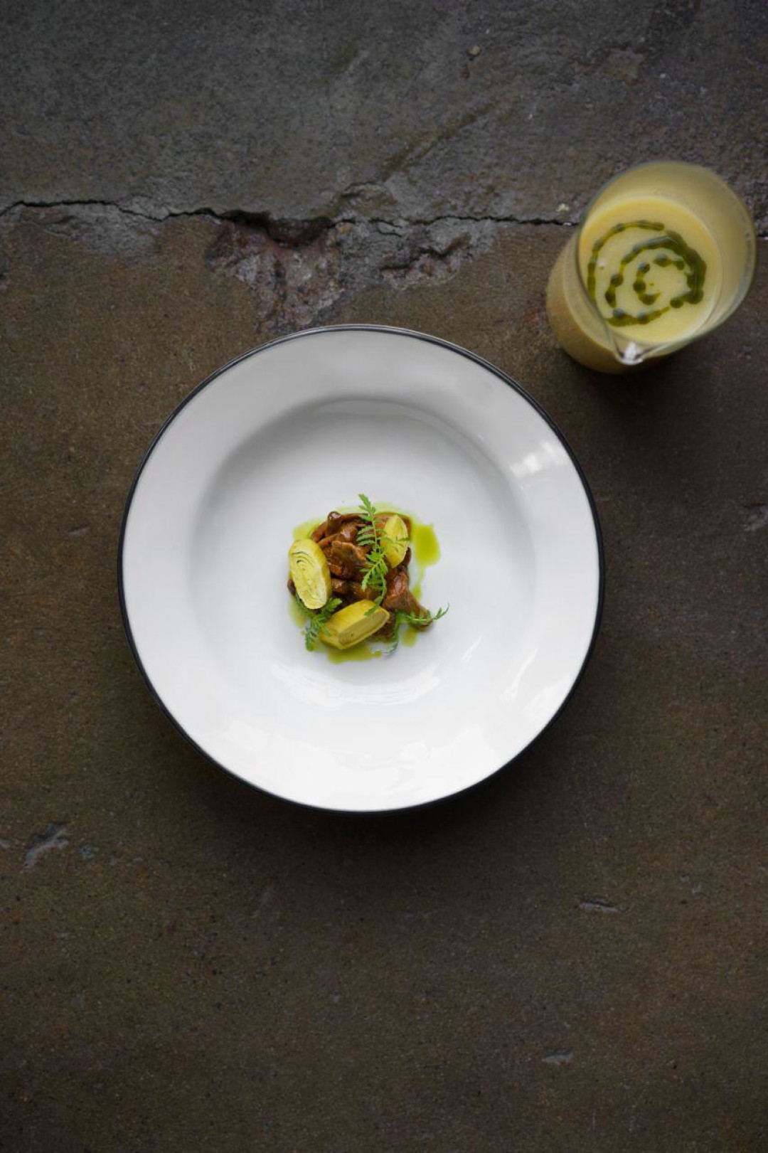 Маринованный лук порей, масло из укропа, а также солёные лисички, которые поливаются пюре из стеблей капусты кольраби.