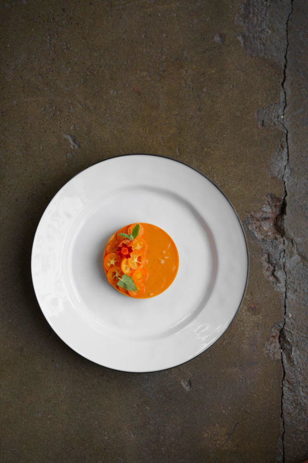 Корж тарта выполнен из миндальной муки, а основа из тофу, облепихи и сиропа топинамбура. Сверху все посыпано цукатами из кумквата (это представитель семейства цитрусовых) и бархатцами, которые тоже можно (и нужно) есть. Естественно, этот десерт sugar- и gluten-free.