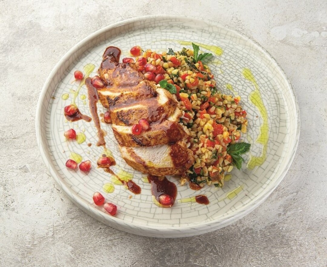 6. Выложите салат с булгуром на блюдо, сверху — нарезанные по диагонали ломтики куриной грудки. Украсьте зернами граната, листиками мяты и подавайте.