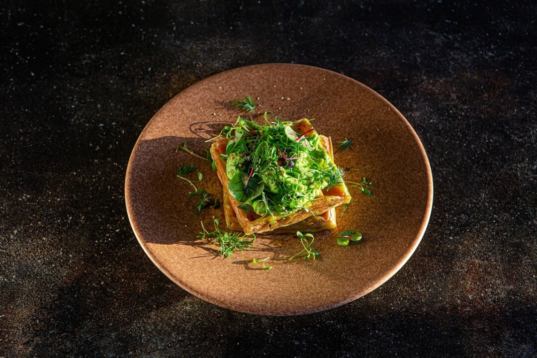 6. Зелень порубите. Разложите вафли по тарелкам, сверху распределите крем, посыпьте зеленью и подавайте.