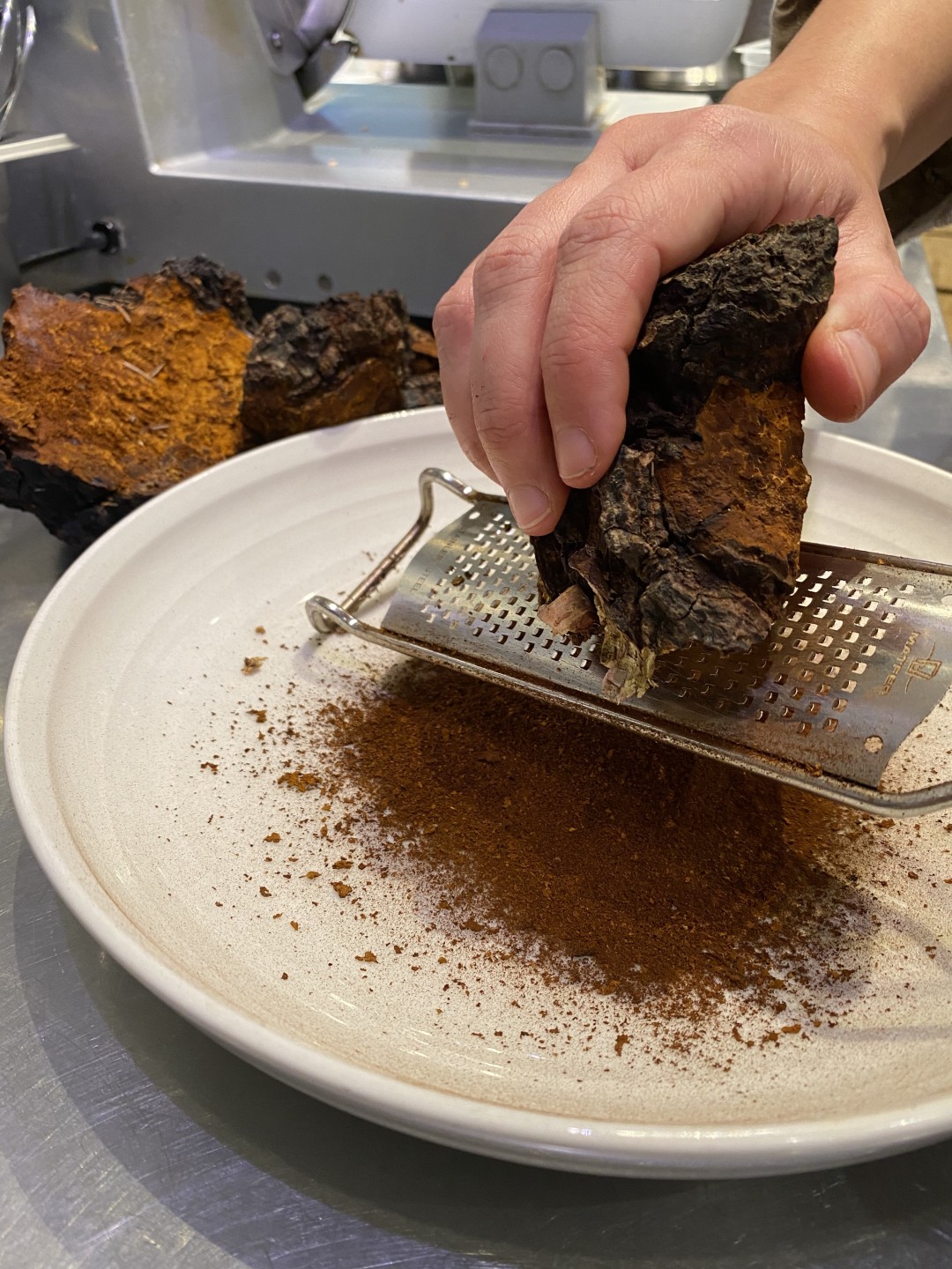 В Anna’s Secret Garden готовят кофе из гриба чага — стерильной формы трутовика, его еще называют березовым грибом. Шеф-повар Виктория Мосина специально ездит в лес, собирает грибы и вручную измельчает на терке. Готовят его по технологии эспрессо и добавляют растительное молоко. Чага не обжигается, поэтому сохраняет полезные свойства.