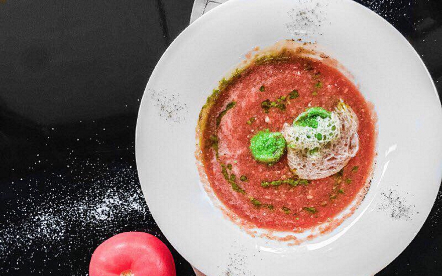 Холодный томатный суп в Jerome с нежной моцареллой буррата и неаполитанским базиликом: простая, но здорово исполненная классика — базилик, между прочим, растет прямо в ресторане.