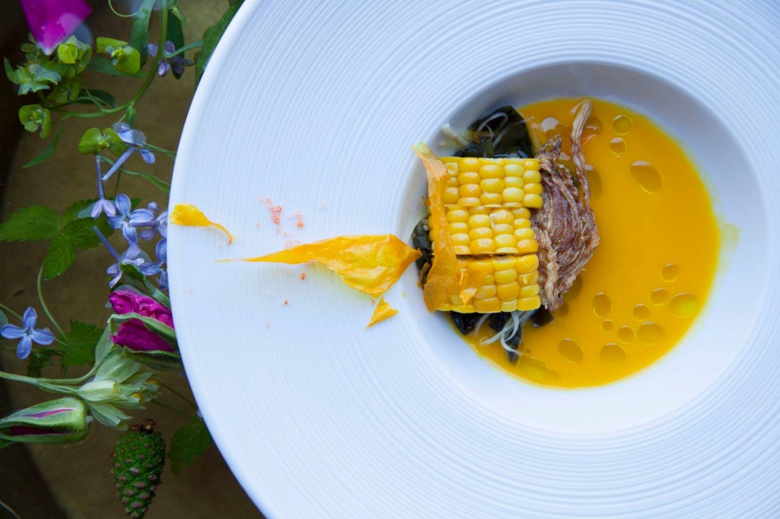 В вегетарианском сете бутик-ресторана EM Эдуарда Мурадяна желтый гаспачо идет с кукурузой су-вид с вакаме и фенхелем: сет из исключительно вегетарианских блюд, каждое из которых небольшая, но впечатляющая гастроподелка, вообще лучшее решения для жарких дней.