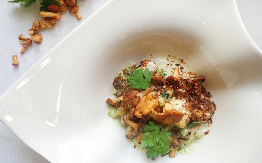 Свежеобжаренные лисички в итальянском ресторане запекают с корнеплодами: топинамбуром, пастернаком, корнем сельдерея и картофелем. Сверху блюдо поливают эспумой из сыра таледжио, посыпают пылью из лука порей и крамбла из корнеплодов.