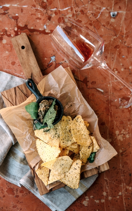 Во фриковатом грузинском «Каха баре» дают не только хрестоматийную грузинскую кухню. В блюде гуакомоле обошлись без канонического авокадо — знаменитую мексиканскую закуску делают из баклажанов. Овощ жарят до вожделенной корочки и перетирают вручную, кладут кинзу и чеснок, красный острый перец и мацони для мягкости; приносят с кукурузными чипсами.
