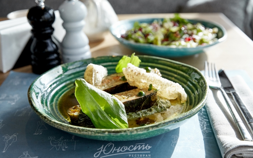 В гинзовской «Юности» в Приморском районе с грузинской кухней отношения на ты, поэтому на кухне позволяют кулинарные вольности. Карпаччо делают из баранины, фалафель — из фасоли, а с долмой и вовсе делают невиданное — кладут рыбу. Начинку из рубленой трески и лосося припускают в рыбном бульоне со сливочным маслом и заворачивают в малосольные виноградные листья, подают с соусом сотоли на шпинате. Плюс чипсы — кукурузные и из полбы.