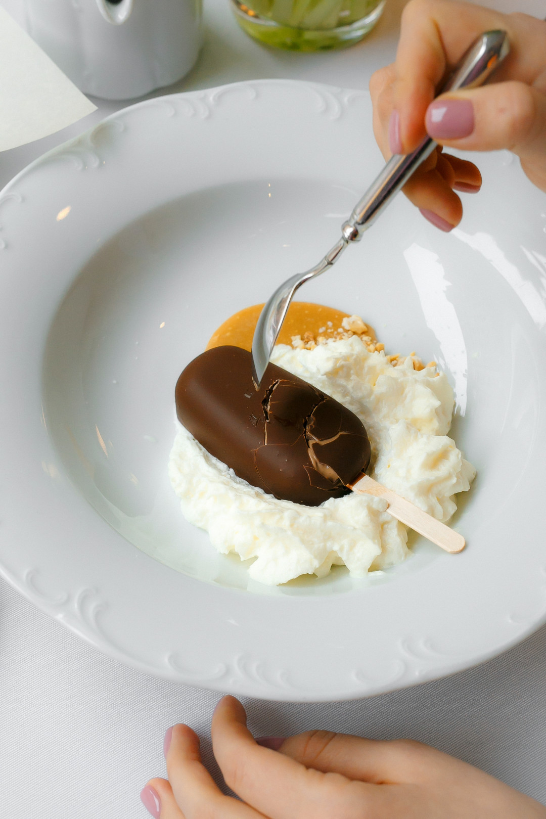 Второму десерту, который появился в ресторанах Probka, суперпиццерии Rыба и загородном «Rыба на Даче», вангуем миллион лайков Instagram и попадание в закладку «Популярное» соцсети: за глазурью у «Эскимо» скрывается шоколадный мусс и соус из соленой карамели с арахисом. Подают его с муссом из белого шоколада. Предупреждаем сразу: успейте включить Boomerang, прежде чем разобьете глазурь. А есть лучше все ингредиенты сразу, усердно перемешав их в тарелке.