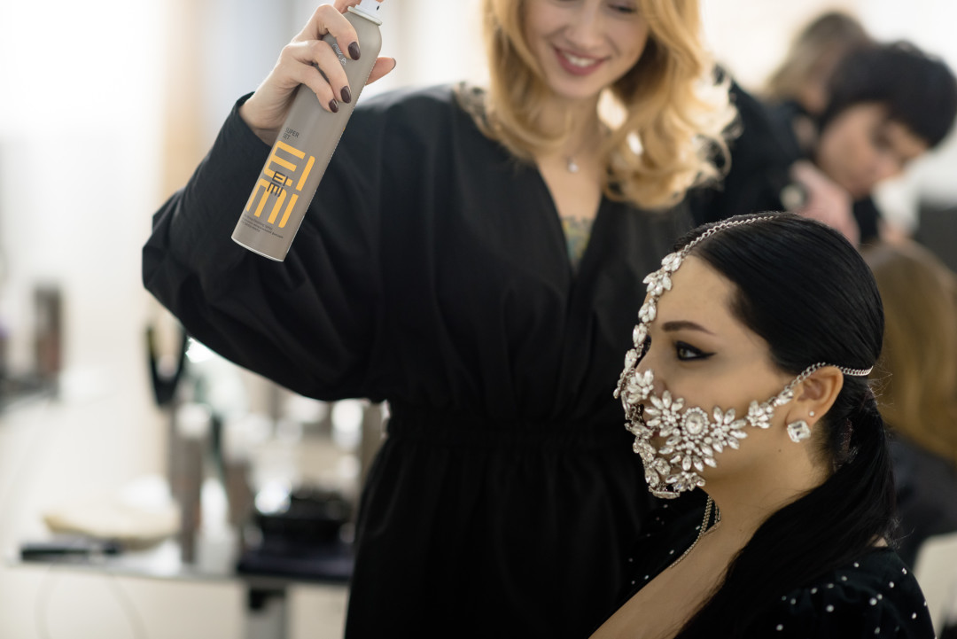 Пока стилисты Wella Professionals трудились над укладкой актрисы БДТ Карины Разумовской в духе старого Голливуда и над эталонным конским хвостом влогера Марии Червоткиной, а мастера салонов «Май» делали золотой маникюр ее коллеге по ютьюбу Виктории Портфолио, бьюти-дива Раксана Самохвалова устроила квест профессионалам Wella Professionals. На первый взгляд, задача была ясной: волосы нужно разделить на прямой пробор, выпрямить и стянуть внизу резинкой. Но когда в деле задействован реквизит из триллера «Клетка», все становится не тем, чем кажется. Лицевая маска российского бренда Get Man Jewelry с креплениями на затылке требовала выверять геометрию прически практически с циркулем. Или с фантастическим глазомером, который и обнаружили в себе стилисты.