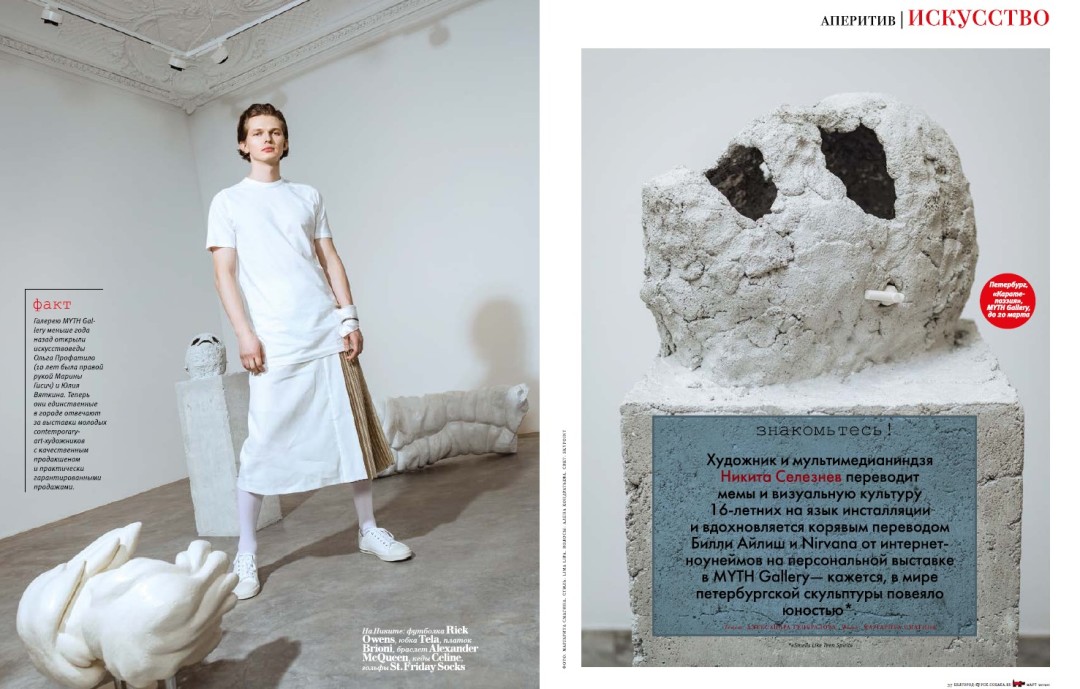 Художник и мультимедианиндзя Никита Селезнёв переводит мемы и визуальную культуру 16-летних на язык инсталляции и вдохновляется корявым переводом Билли Айлиш и Nirvana от интернет-ноунеймов на персональной выставке в MYTH Gallery — кажется в мире петербургской скульптуры повеяло юностью